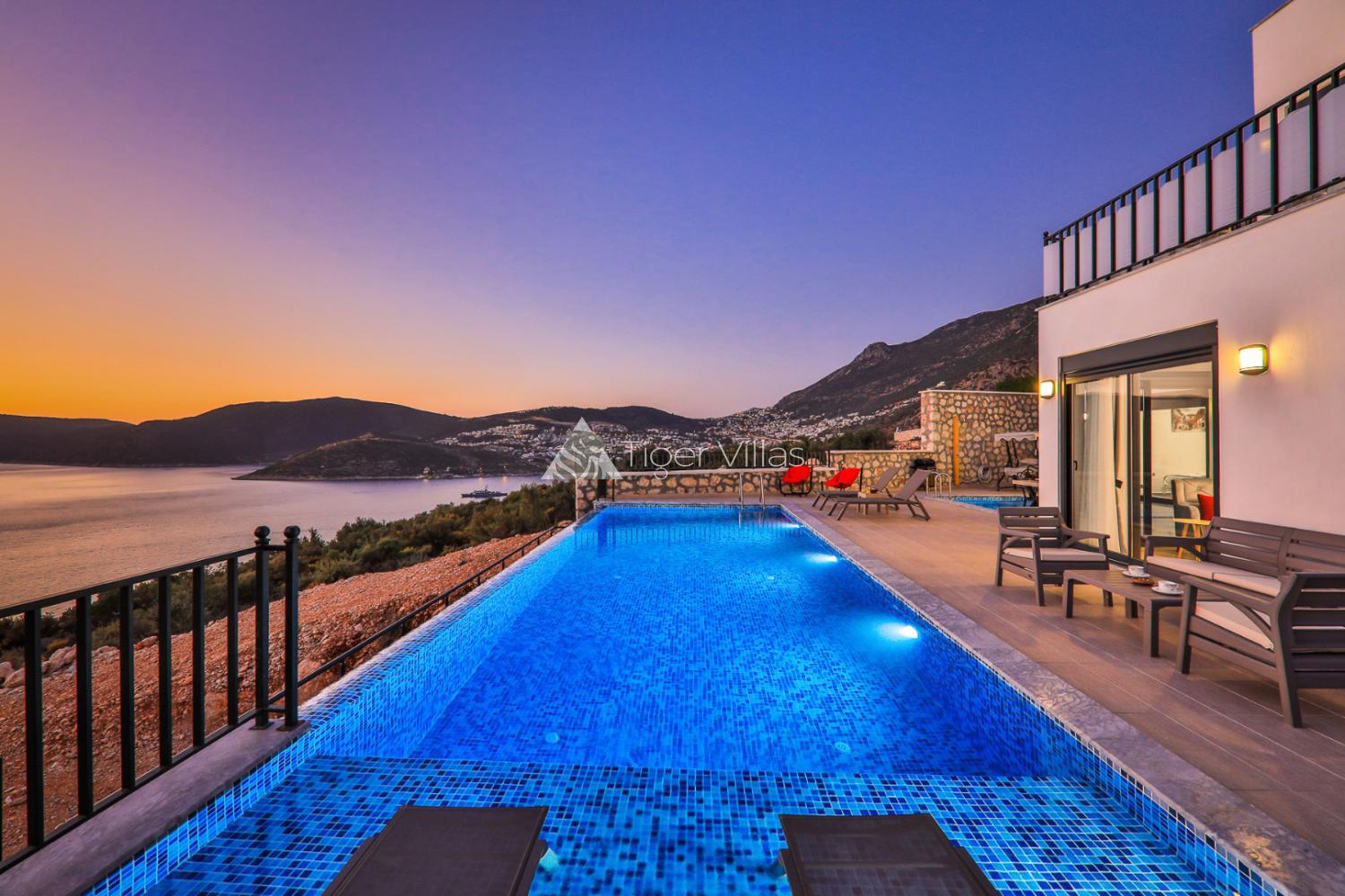 Villa Nazlı A located in Kalkan-Kışla. It has a beautiful sea view with unique nature view. Villa has 2 bedrooms which hold a capacity of 4 people. In one of the bedrooms there is a two person jacuzzi. Villa has a great poolside and equipped with BBQ and swing, there is also little pool for the kids in the garden. Villa Nazlı A is 2 km from the centre of Kalkan and walking distance from the sea.