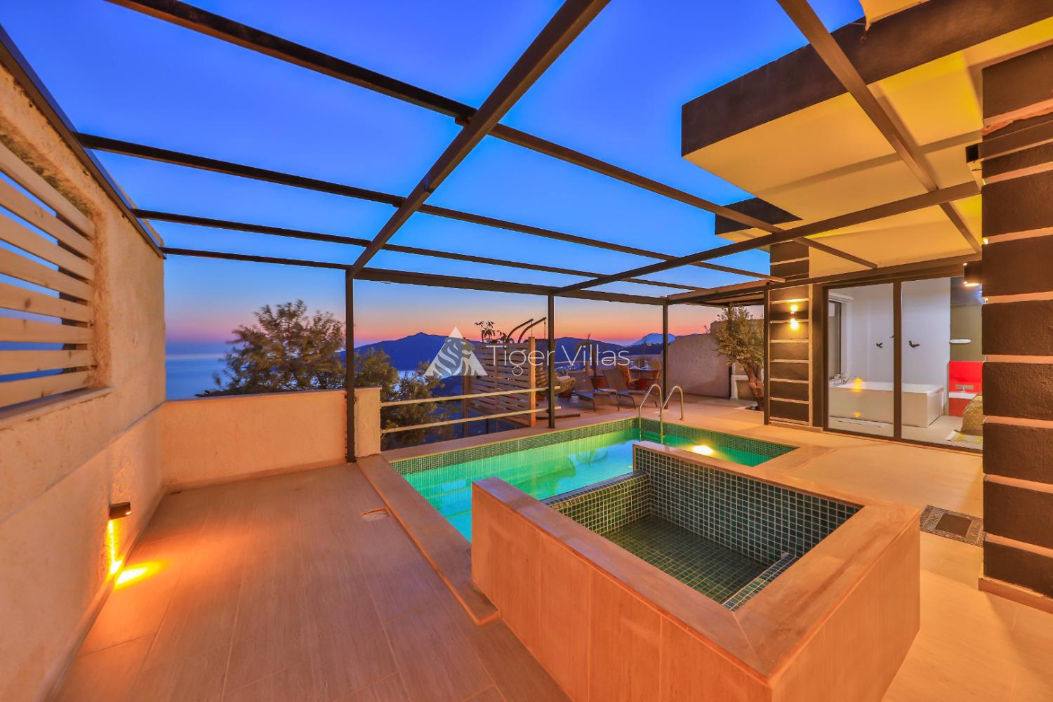 Our villa for rent with sea view, located in Kördere, Kalkan, has a 1-bedroom accommodation capacity for 2 people. There is a private heated jacuzzi in the bedroom. Our villa, which has a covered and sheltered pool terrace, has been carefully designed for our honeymoon couples. It has been designed with all the possibilities in mind to meet all the needs of our guests.