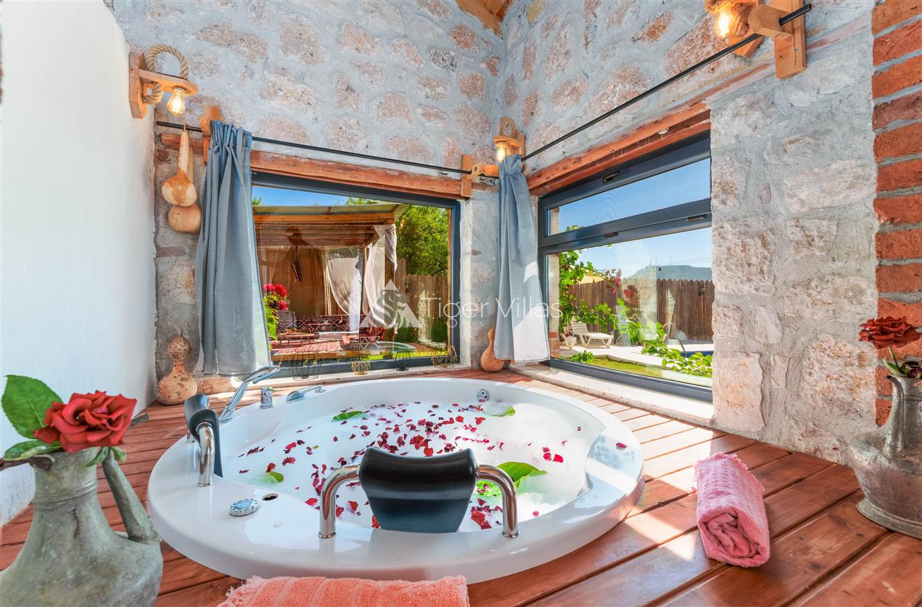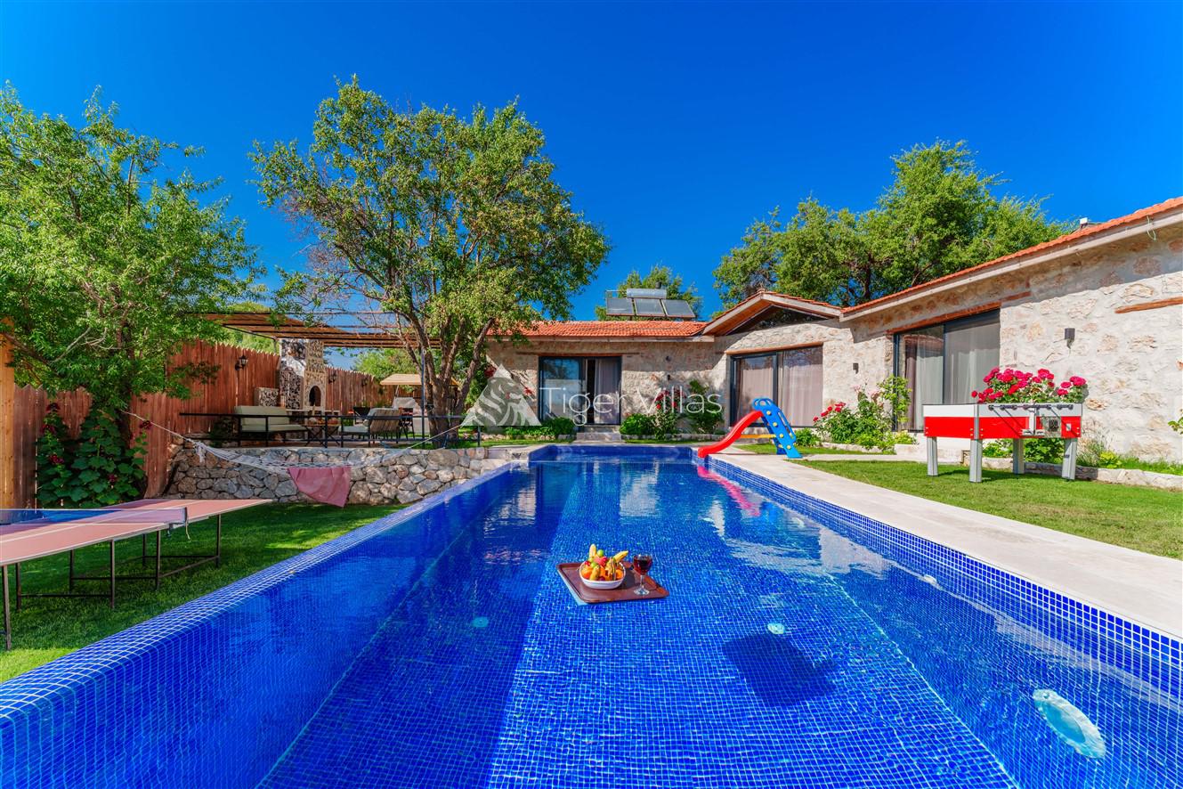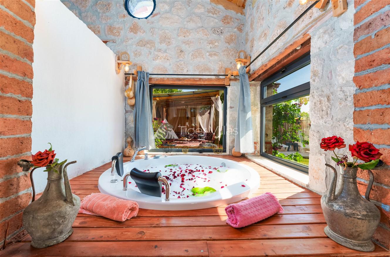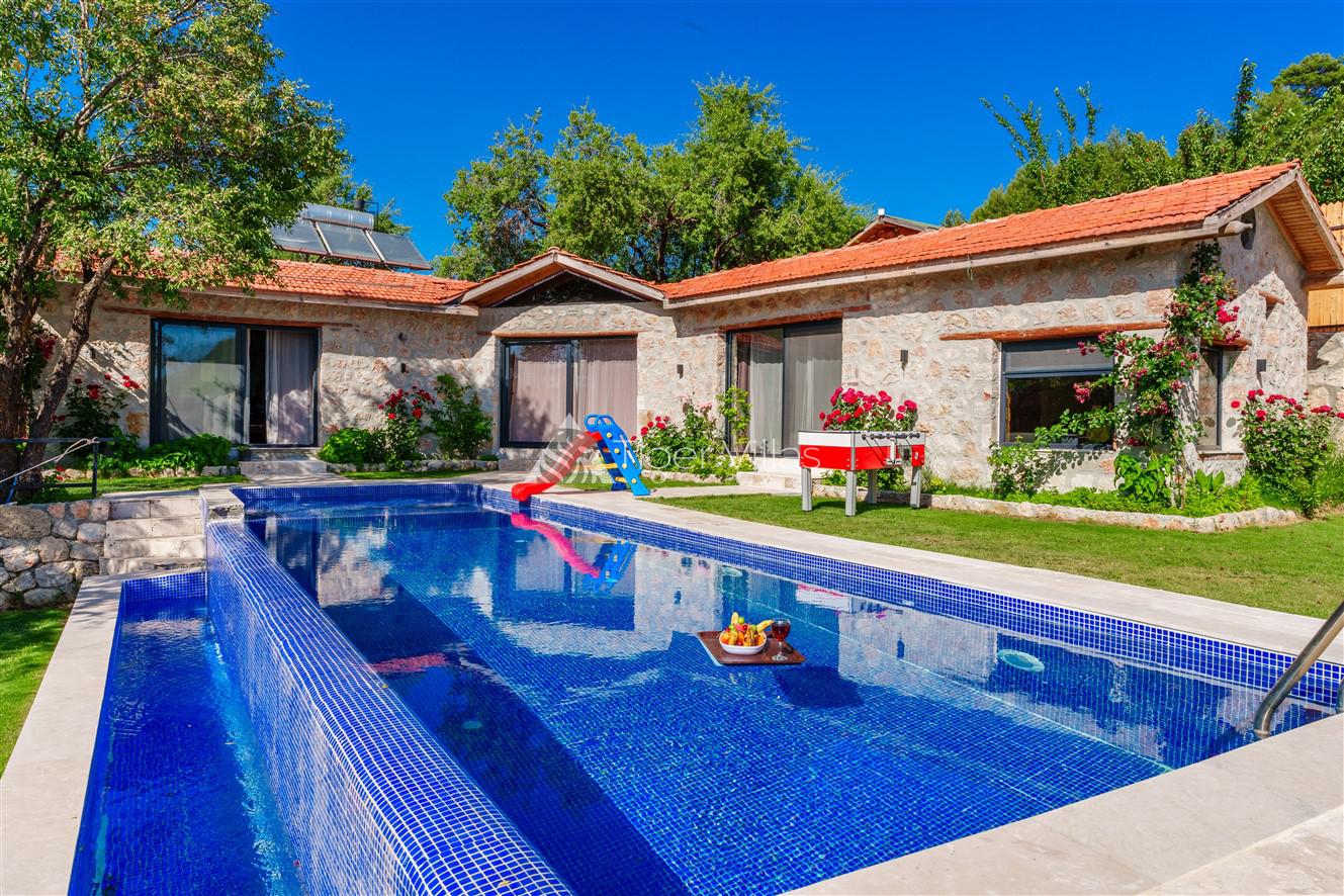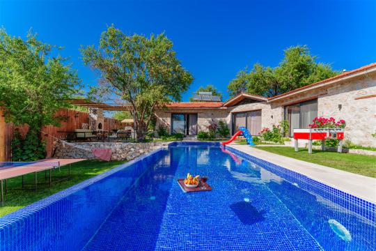 Villa Akbas 2 was built in the Sarıbelen region of Kalkan by prioritizing stone and woodwork. Our villa, which has two bedrooms and an accommodation capacity of four people, is in the conservative villas category because the pool terrace is sheltered. You can rest your body and soul thanks to the jacuzzi in the suite bedroom of our villa, which has a spacious and comfortable atmosphere. In the pool area, there is a children's pool where your children can have fun while you enjoy your holiday. Our villa, decorated for honeymooners and nuclear families, has been carefully prepared for its precious guests.