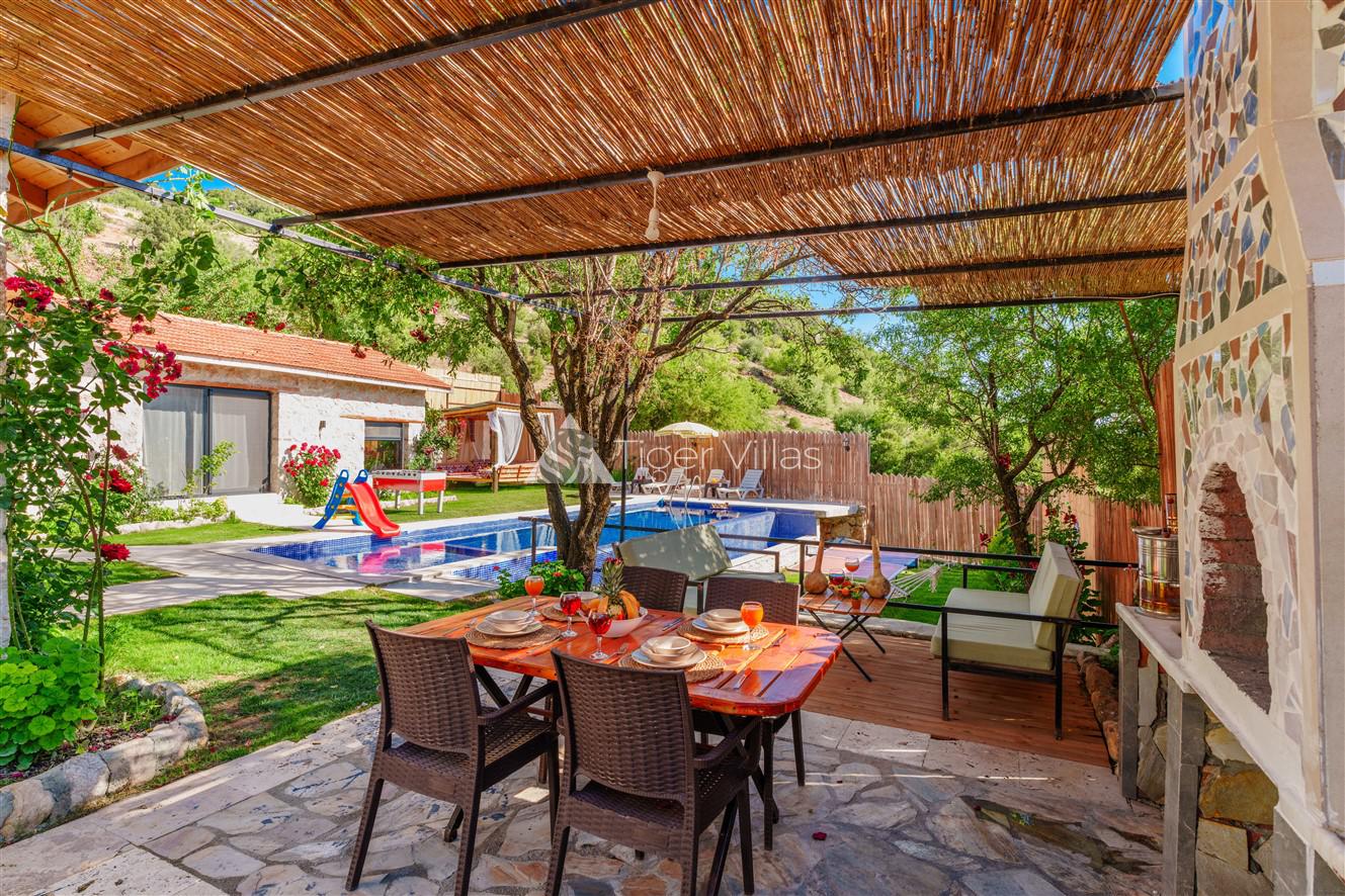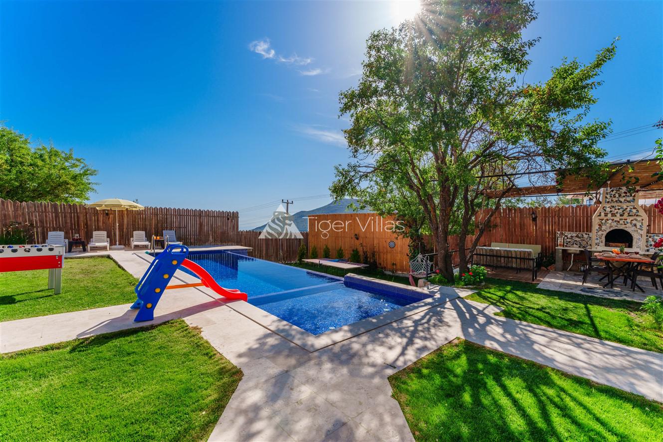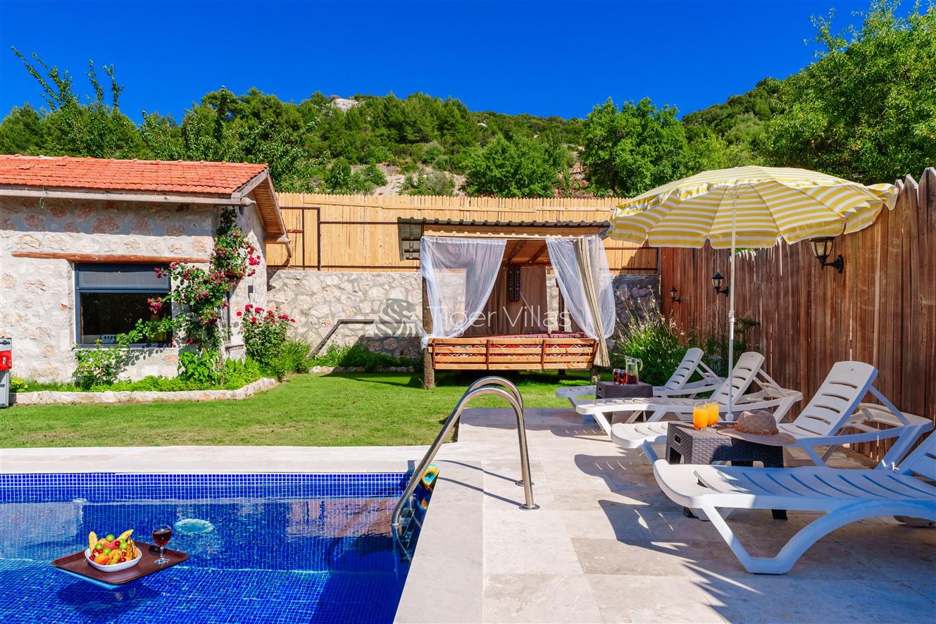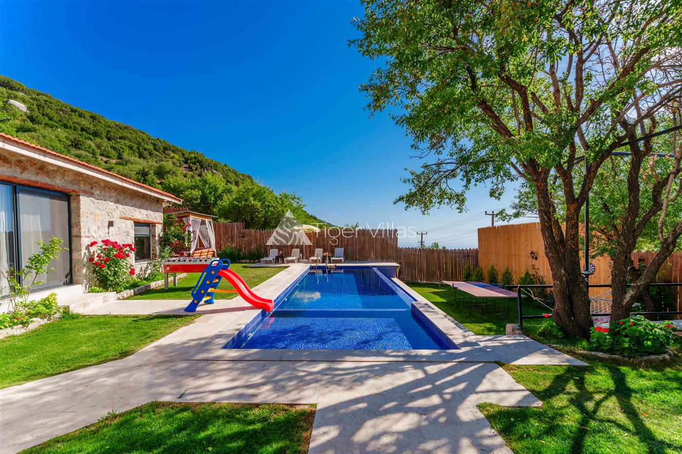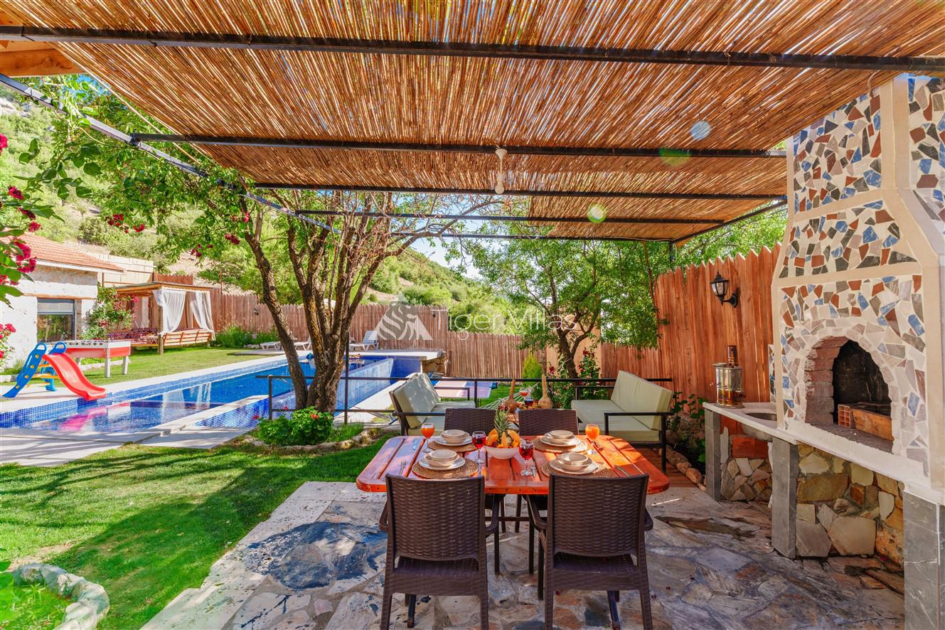 Villa Akbas 2 was built in the Sarıbelen region of Kalkan by prioritizing stone and woodwork. Our villa, which has two bedrooms and an accommodation capacity of four people, is in the conservative villas category because the pool terrace is sheltered. You can rest your body and soul thanks to the jacuzzi in the suite bedroom of our villa, which has a spacious and comfortable atmosphere. In the pool area, there is a children's pool where your children can have fun while you enjoy your holiday. Our villa, decorated for honeymooners and nuclear families, has been carefully prepared for its precious guests.