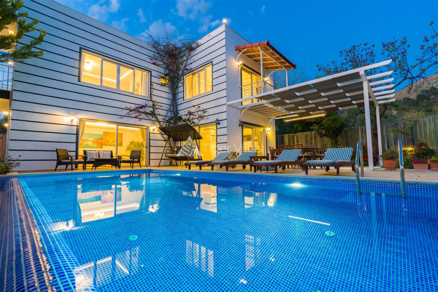 Villa Bugra is one of the villas in Uzumlu Village. 2 bedrooms 4 persons the ideal place for those who want quiet, peaceful holiday in Uzumlu village, Kalkan 10 km away from this villa which is a silence, peace and happiness is not easy to give up. Villa Located in a lush ground, Villa Bugra is a stylish and elegant villa with panoramic view of Patara. Villa Bugra, which may be a great choice for guests who want to spend the holiday beautifully and comfortably, can comfortably accommodate 4 people. There is a spacious and stylish hall, open kitchen, two suite bedrooms, stone barbecue, parking, nice view, nature and sea With balconies with views, green garden, spacious pool terrace and jacuzzi master suite, is a honeymoon house, one step ahead of other honeymoon villas. The nearest shop and restaurant is within walking distance of our villas. Kalkan center and beach is only 15 minutes by car.