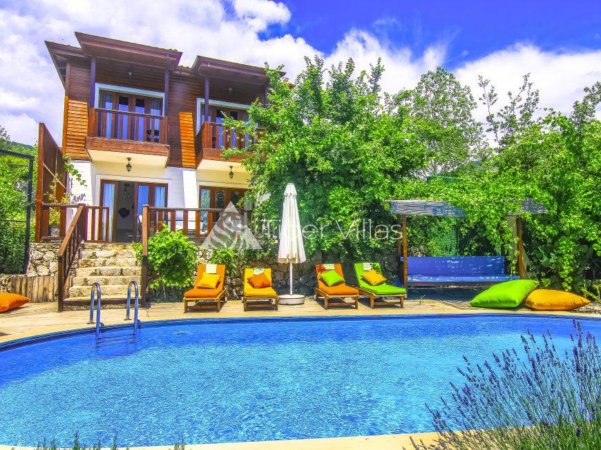 Located in the islamlar village of Kalkan, in a quiet location in nature and greenery, our rental villa, which will keep you away from the city air and noise, has an accommodation capacity of 8 people with 4 bedrooms. The pool terrace of our villa is sheltered and suitable for conservative families. Our villa, which has a wooden structure, has the comfort that will make you feel like at home. Our rental villa has been designed with all the possibilities in mind to meet all the needs of our guests.