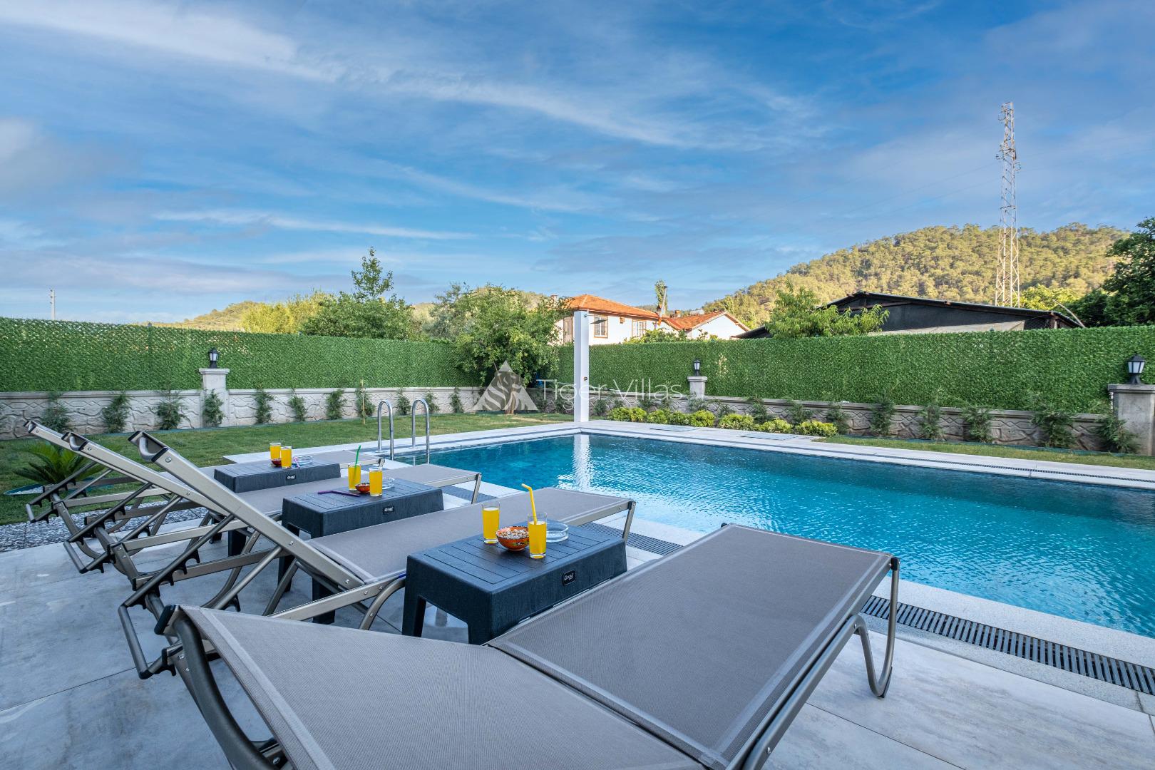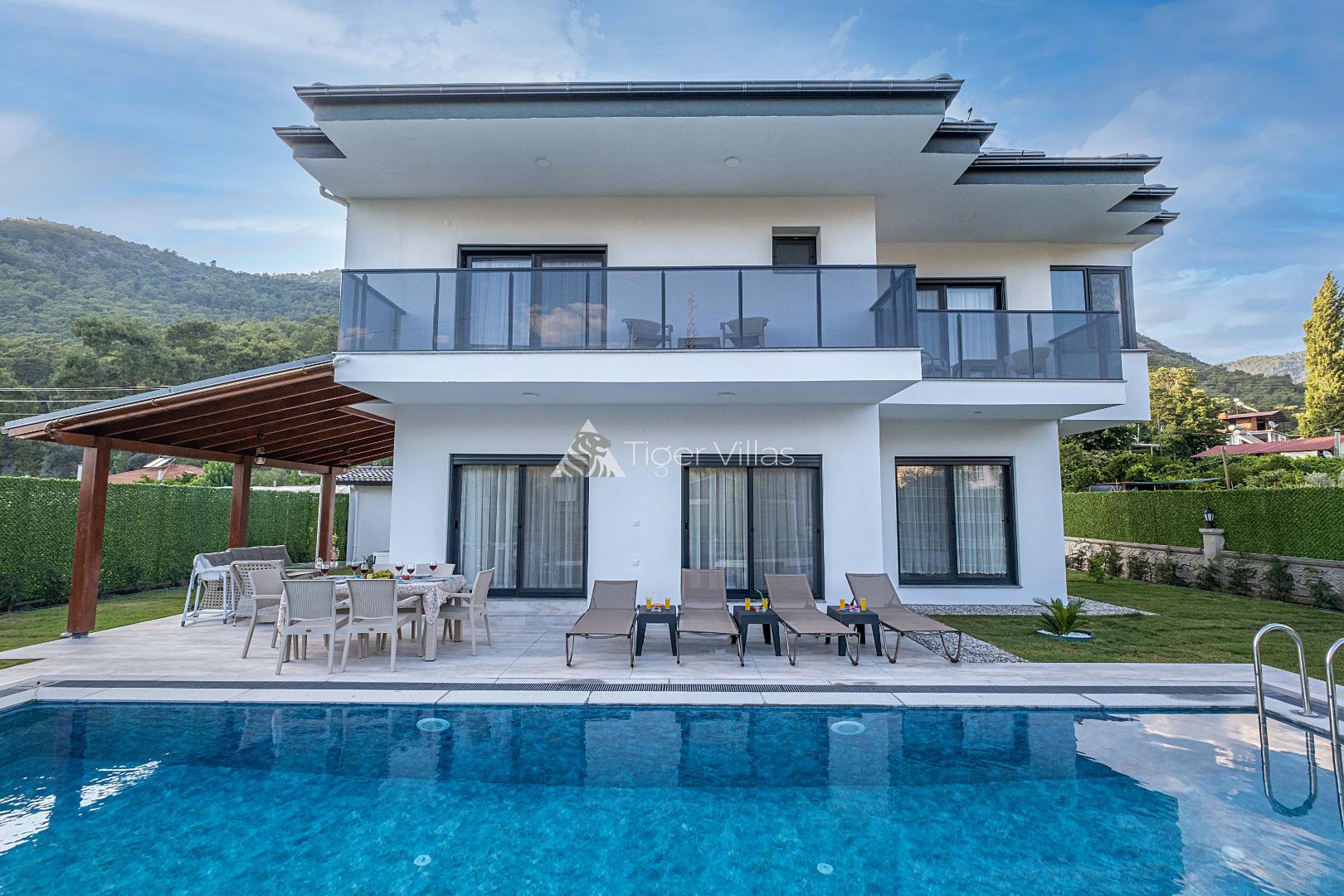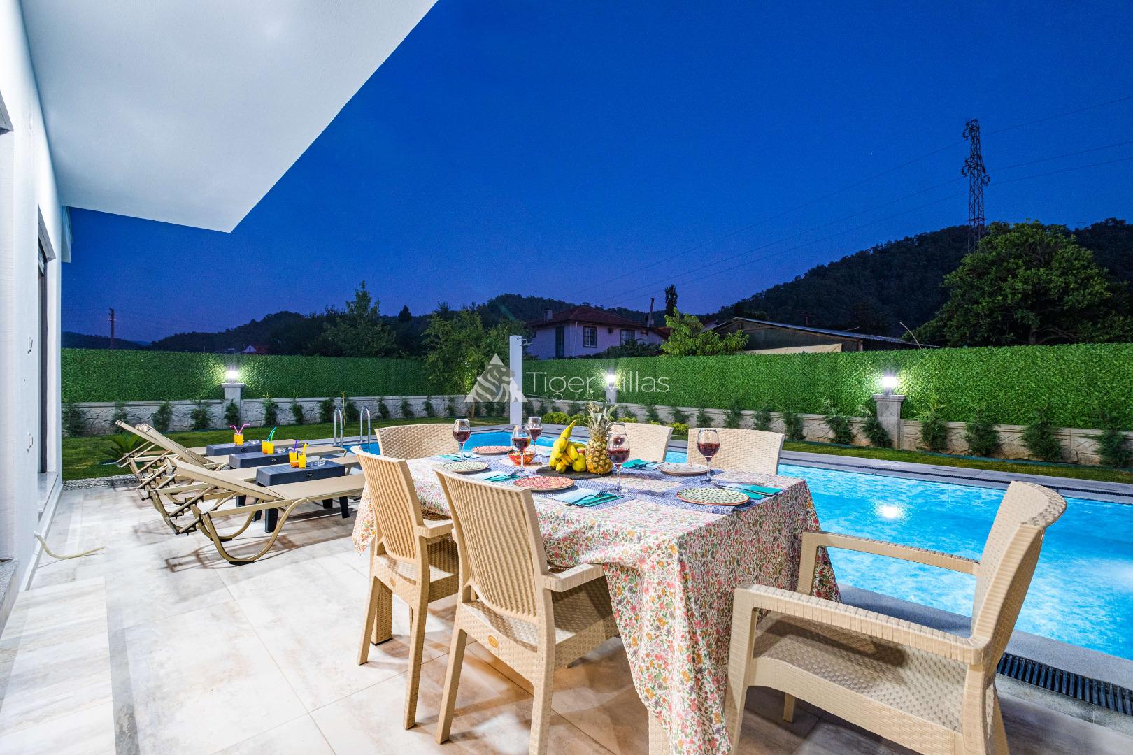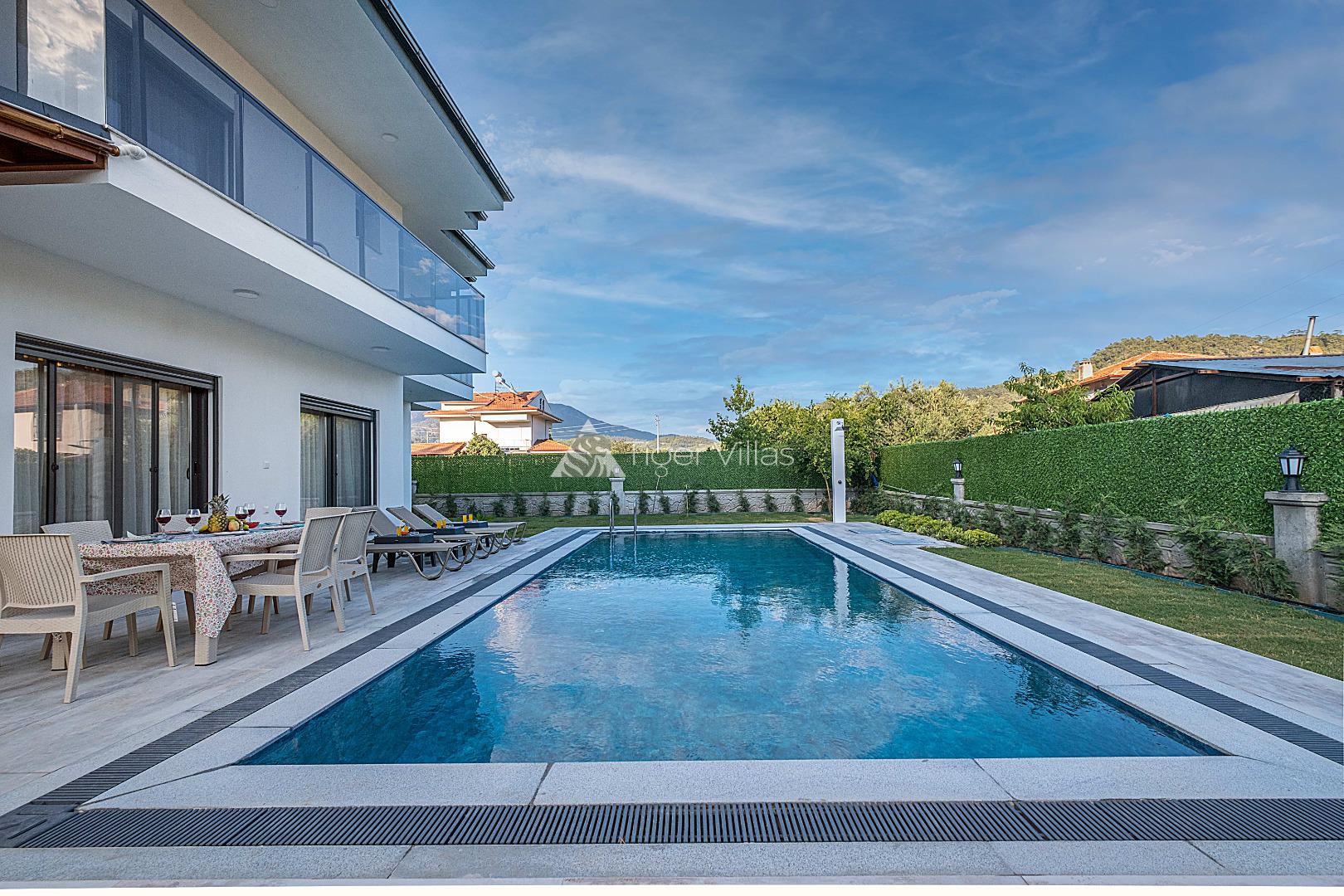 Villa Duru Uno is located in nature in Fethiye Göcek İnlice region. It can accommodate eight people in four bedrooms. There is a jacuzzi and sauna in our villa. The pool terrace of our villa, which is located in a detached position in the large garden, is not visible from the outside. For this reason, our conservative families can have a pleasant holiday with peace of mind. It is very comfortable and stylish with its interior and exterior design. You can have a pleasant time with your loved ones from the garden and pool terrace of our villa, or you can join the boat tours organized to the deep blue bays of Göcek and discover the unique beauties.