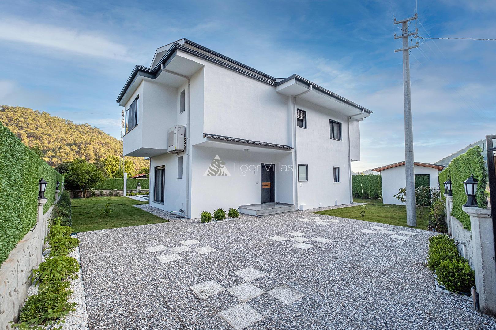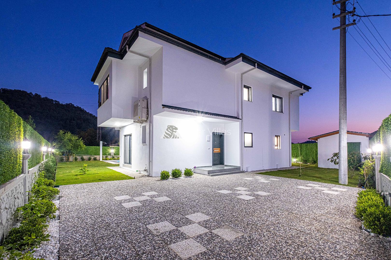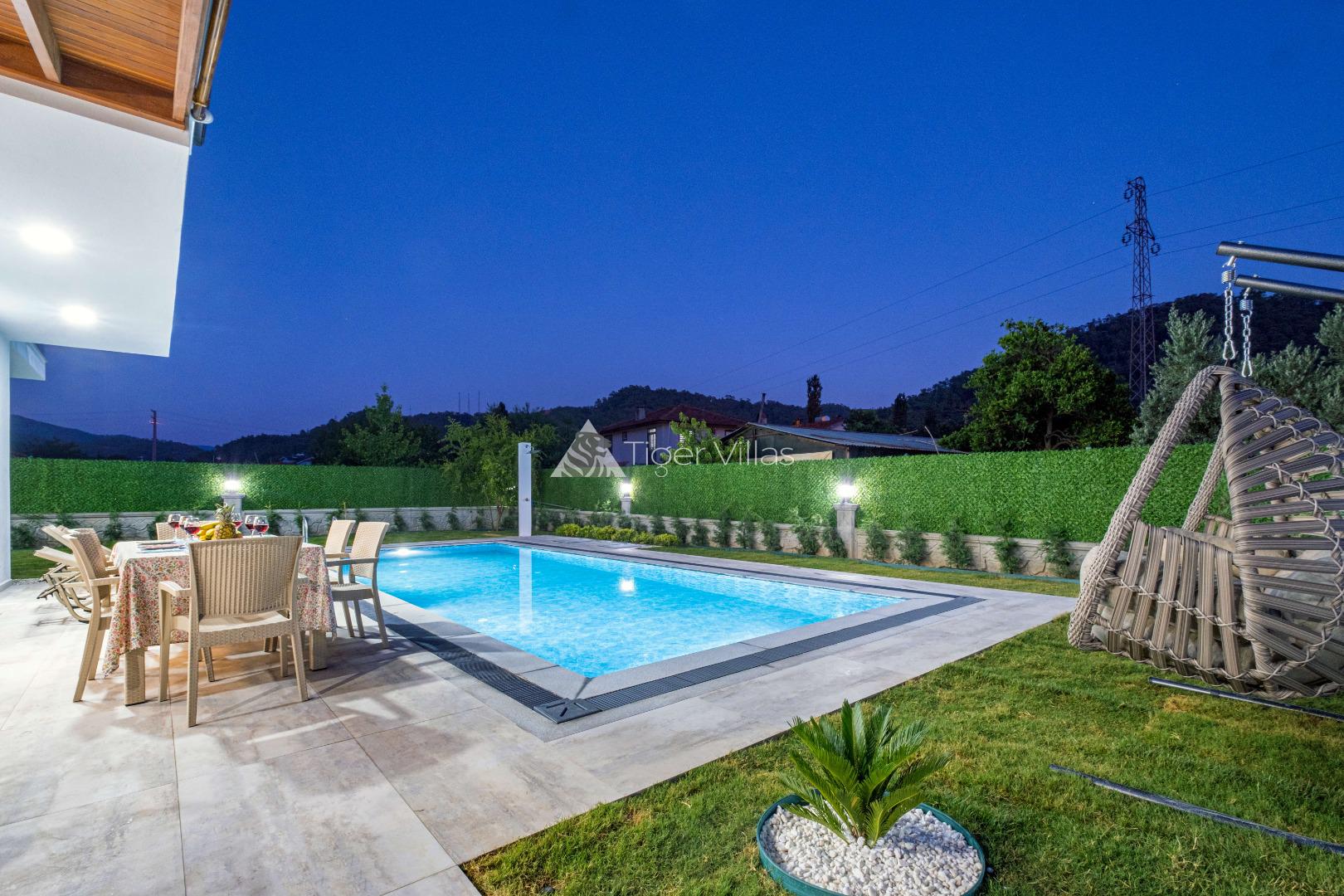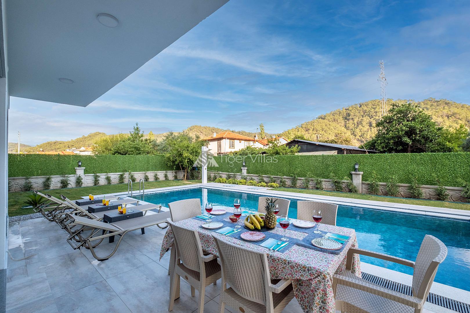 Villa Duru Uno is located in nature in Fethiye Göcek İnlice region. It can accommodate eight people in four bedrooms. There is a jacuzzi and sauna in our villa. The pool terrace of our villa, which is located in a detached position in the large garden, is not visible from the outside. For this reason, our conservative families can have a pleasant holiday with peace of mind. It is very comfortable and stylish with its interior and exterior design. You can have a pleasant time with your loved ones from the garden and pool terrace of our villa, or you can join the boat tours organized to the deep blue bays of Göcek and discover the unique beauties.