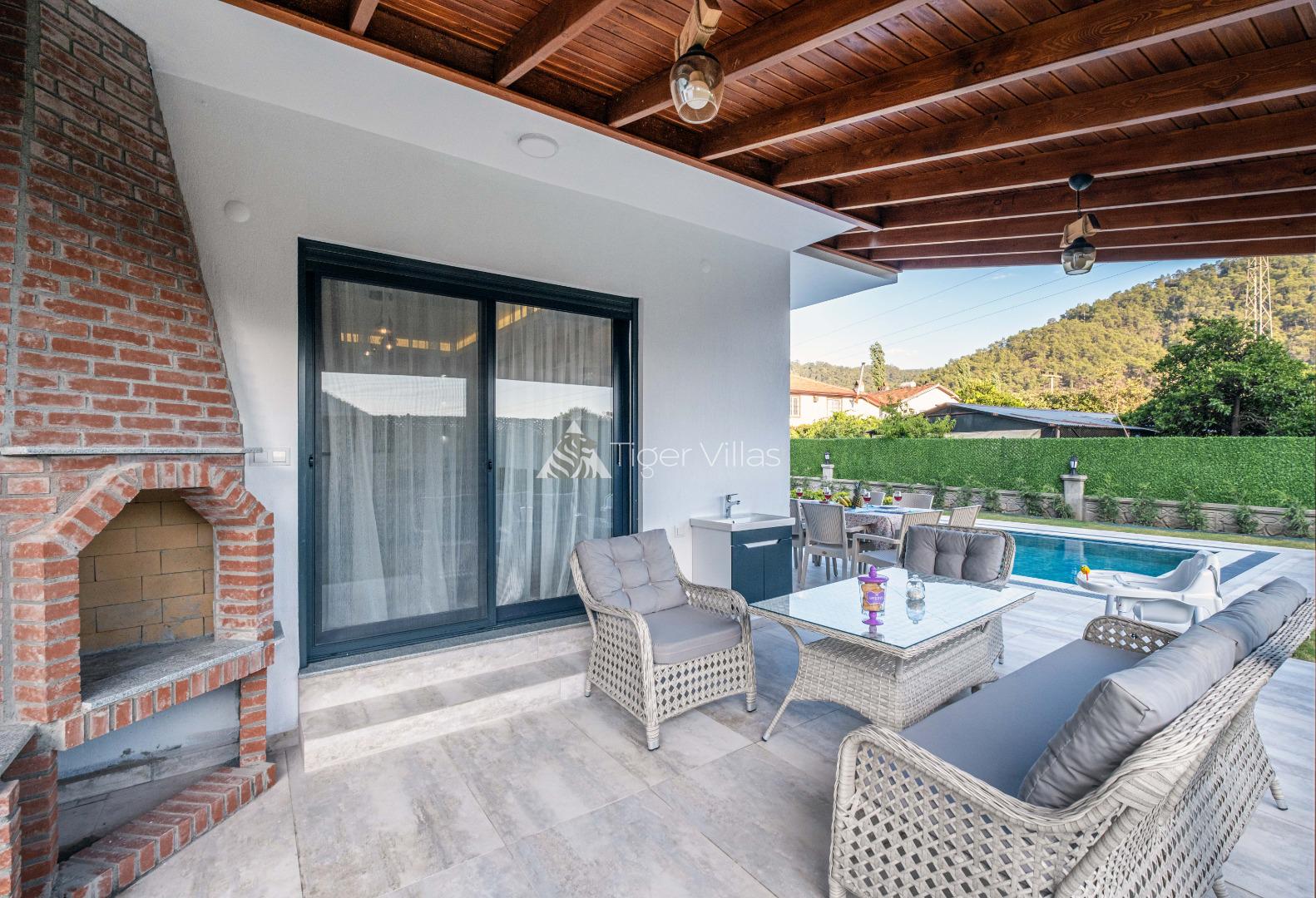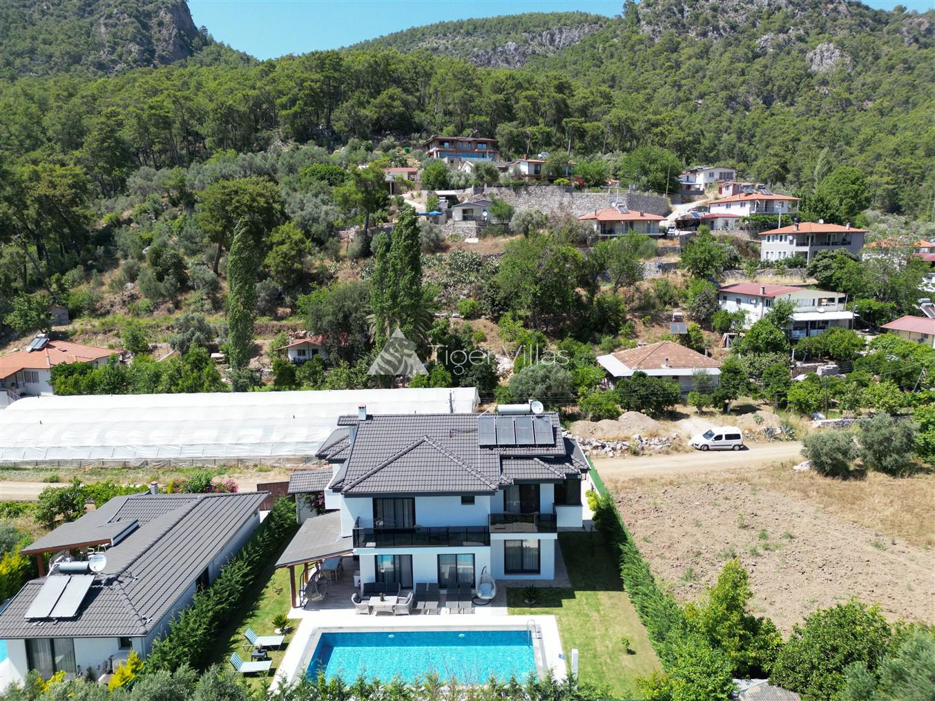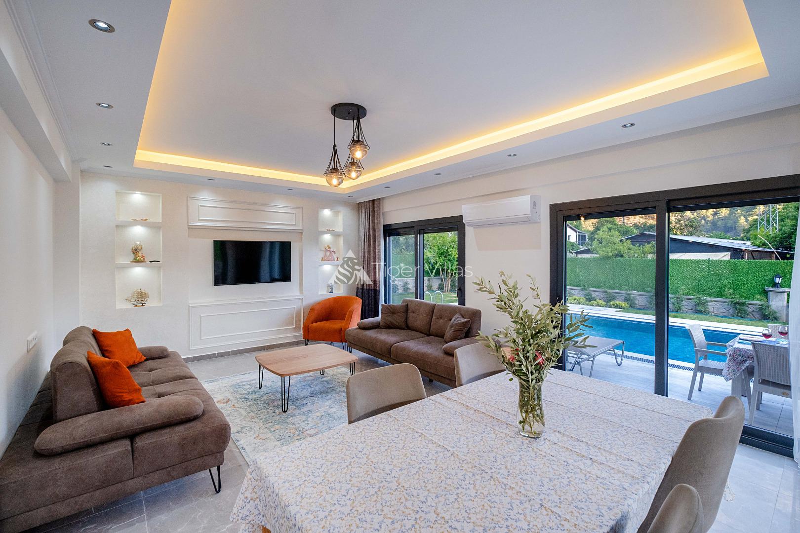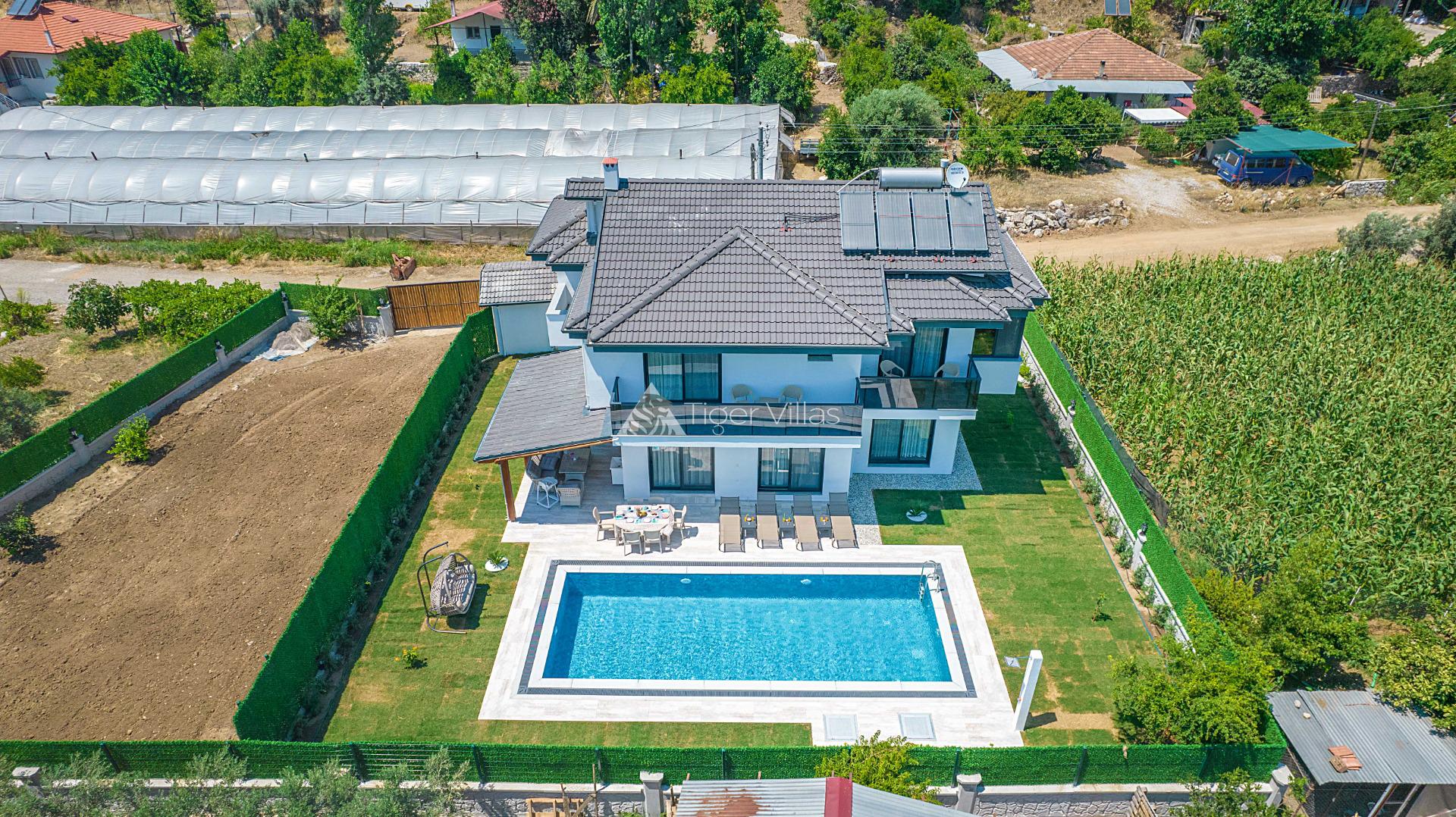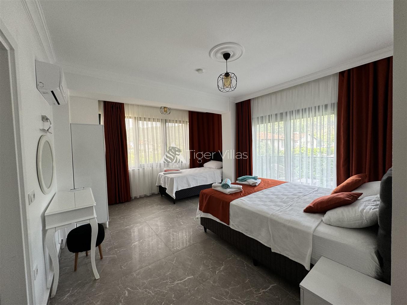 Villa Duru Uno is located in nature in Fethiye Göcek İnlice region. It can accommodate eight people in four bedrooms. There is a jacuzzi and sauna in our villa. The pool terrace of our villa, which is located in a detached position in the large garden, is not visible from the outside. For this reason, our conservative families can have a pleasant holiday with peace of mind. It is very comfortable and stylish with its interior and exterior design. You can have a pleasant time with your loved ones from the garden and pool terrace of our villa, or you can join the boat tours organized to the deep blue bays of Göcek and discover the unique beauties.