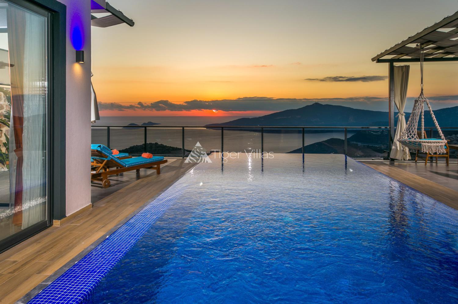 Villa Efe’s pool terrace is wonderfully designed and offers fantastic views of the sea. The good sized, contoured swimming pool is bordered with quartz stone and can be illuminated in the evening.This is the perfect location to relax at the end of the day while the sun is setting over the Kalkan islands...