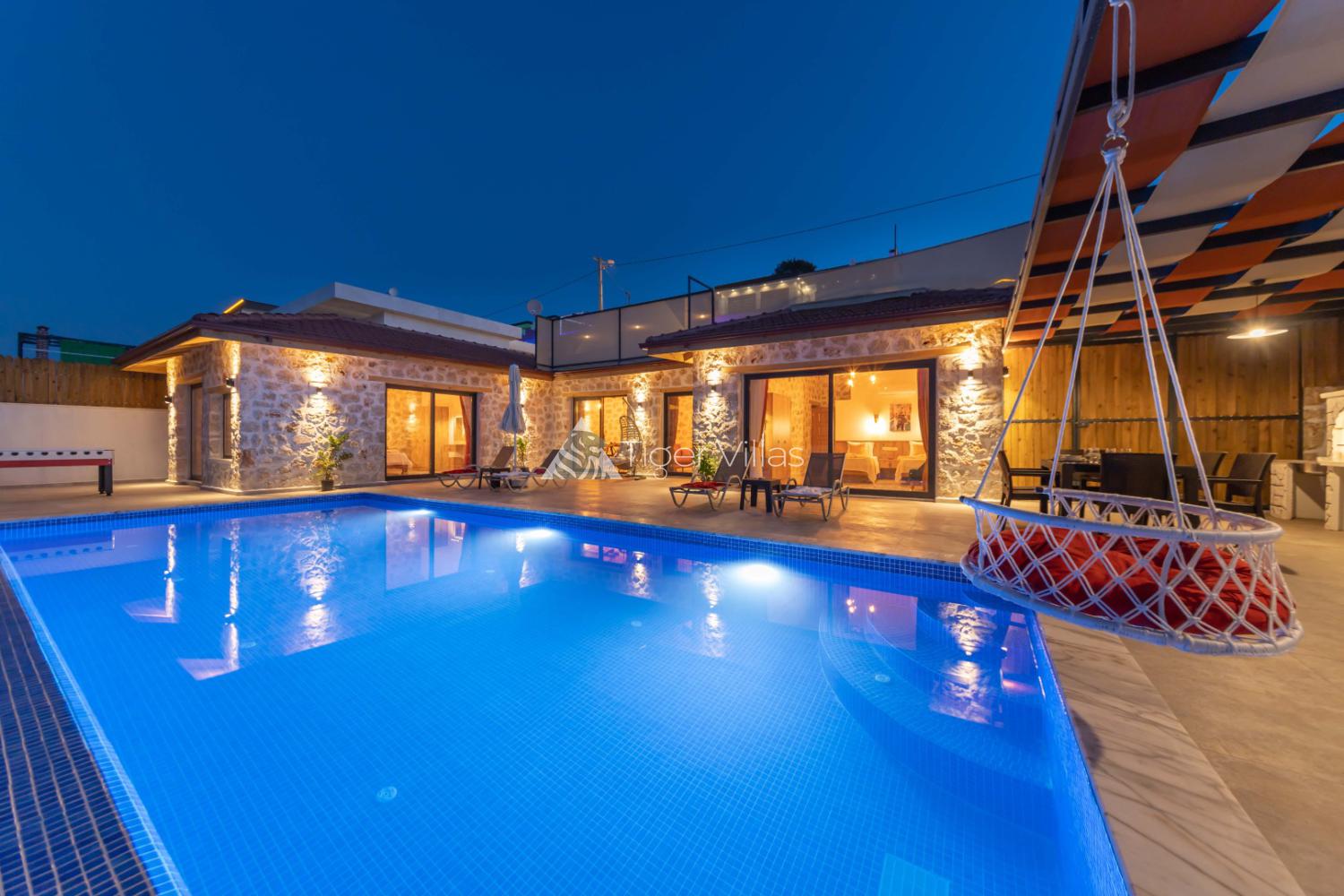 The pool and garden part of our villa is sheltered, allowing you to enjoy the pool comfortably, and you will have the opportunity to rest your soul and body thanks to the private pool and jacuzzi in our villa. It is one of the most ideal villa options for families with children, with its wide garden area and activities such as swing and table football. We are waiting for you, our valued guests, to our carefully designed villa for you to have a nice holiday.- Check-in Time: 16.00Check-out time: 10.00