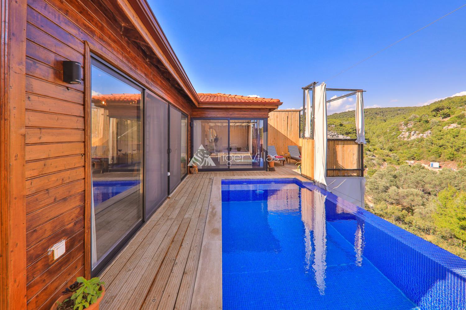 Our rental Villa Flower Gedik, located in nature and greenery in the Patara region of Kalkan, has a 1-bedroom accommodation capacity for 2 people. The pool terrace of our villa, which is suitable for honeymooners, is sheltered. There is a heated jacuzzi in the bedroom of our modern and wooden villa. In our villa, whose entrance is designed with a living room and an American kitchen, exit to the pool terrace can be made from the living room.