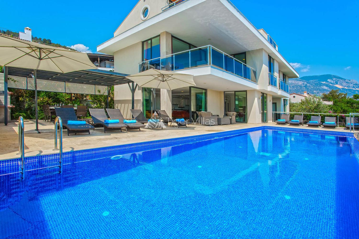 Villa Greenscepe for rent in Kalamar area of Kalkan attracts attention with its location close to the sea and with its magnificent sea view. Our villa, which is included in our Sea View Villas and Luxury Villas options, has an accommodation capacity of 14 people with 7 bedrooms. Villa Greenscepe for Rent, which is an ideal holiday villa for large families or groups of friends, offers the opportunity to watch the magnificent sea view of Kalkan from all bedrooms and the pool terrace. Our villa, which has a very stylish interior and exterior architecture, also has table tennis, pool table and sports equipment.