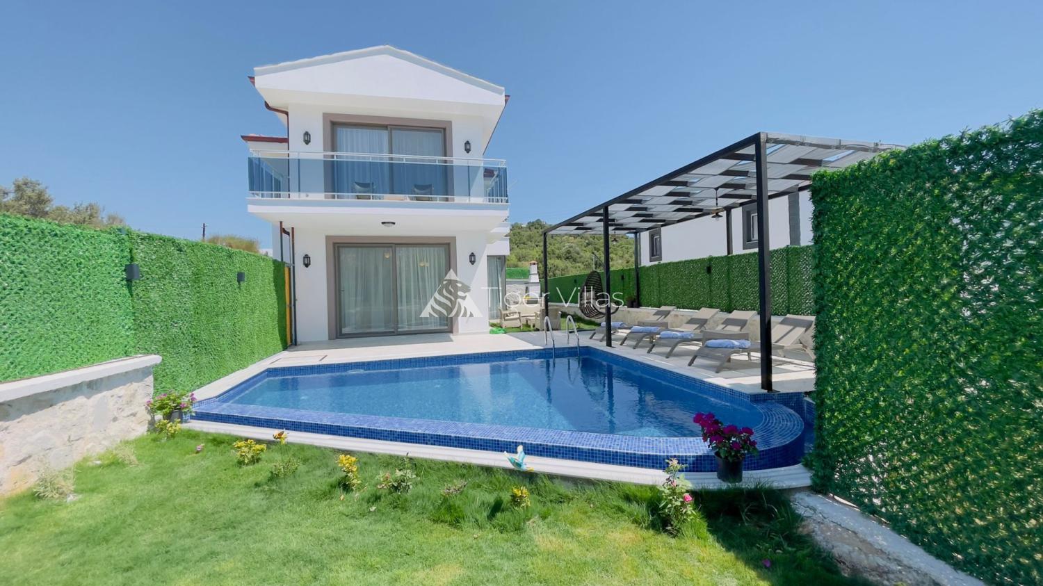 Our rental villa located in Kas, Çukurbağ region has 3 bedrooms and a capacity of 6 people. You can spend a pleasant holiday with your loved ones on the garden and pool terrace of our rental villa, which has a private pool. Many things that our guests may need have been considered in the American kitchen-lounge opening to the pool terrace. The distance of our villa, which includes electricity, water, cylinder-gas, etc. expenses, to the city center of Kaş is 7.5 km