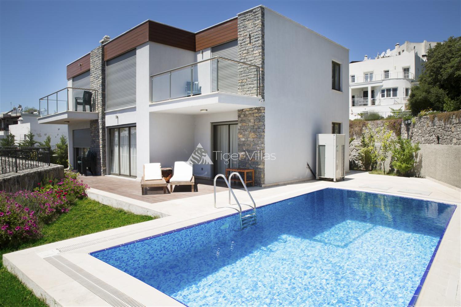 Outdoors: There is a private swimming pool, a garden, a very large terrace/patio, sun loungers and parking lot by the pool outside of our completely detached Villa. About Gumbet