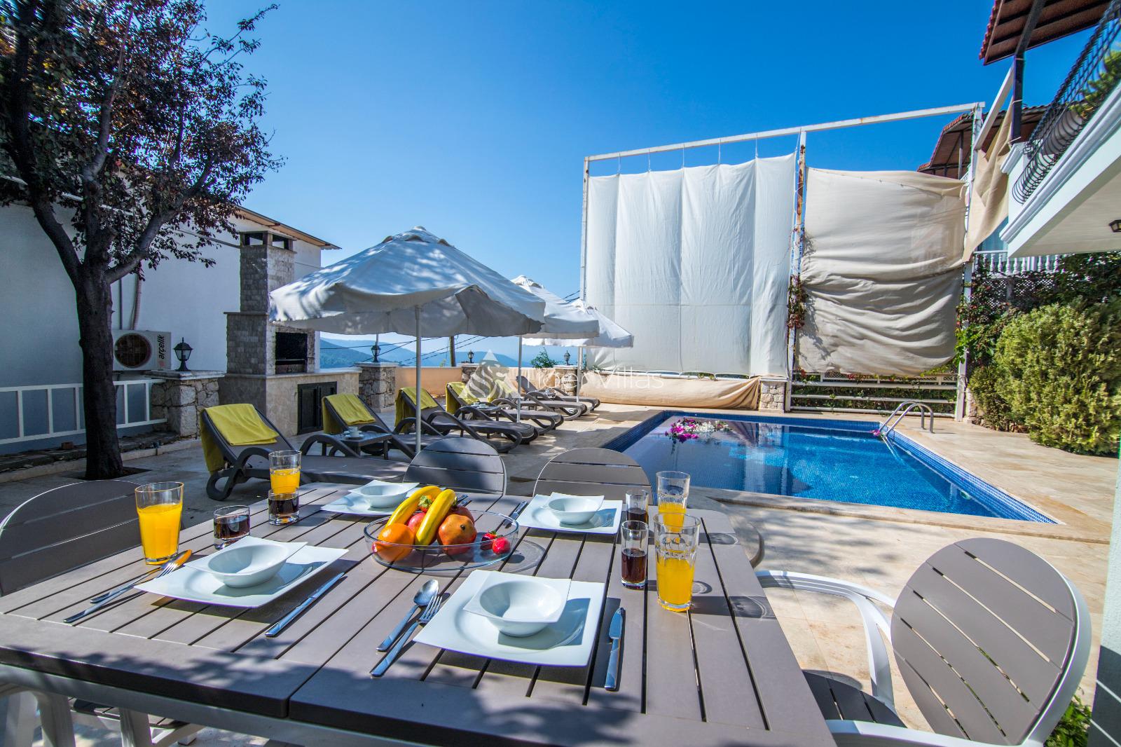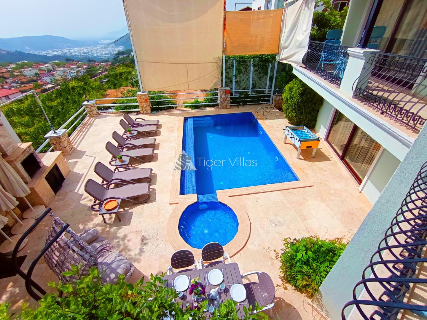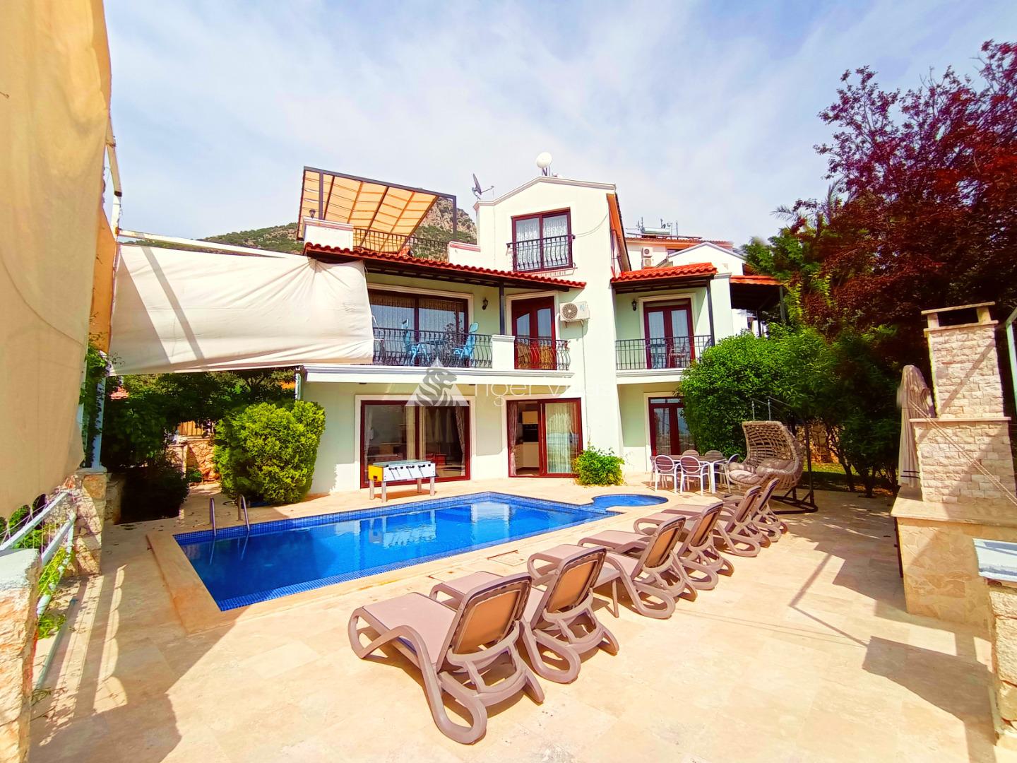 Villa Hazal Our villa, located in Kalkan Akbel region, has a capacity of ten people. It is ideally designed for nuclear families and honeymooners. The pool terrace of our summer villa with five bedrooms is not visible from the outside and we recommend you to evaluate this villa in your conservative villa preference. Our villa has been designed with extremely comfortable and comfortable furniture. We would be happy to host you in our conservative villa with jacuzzi.