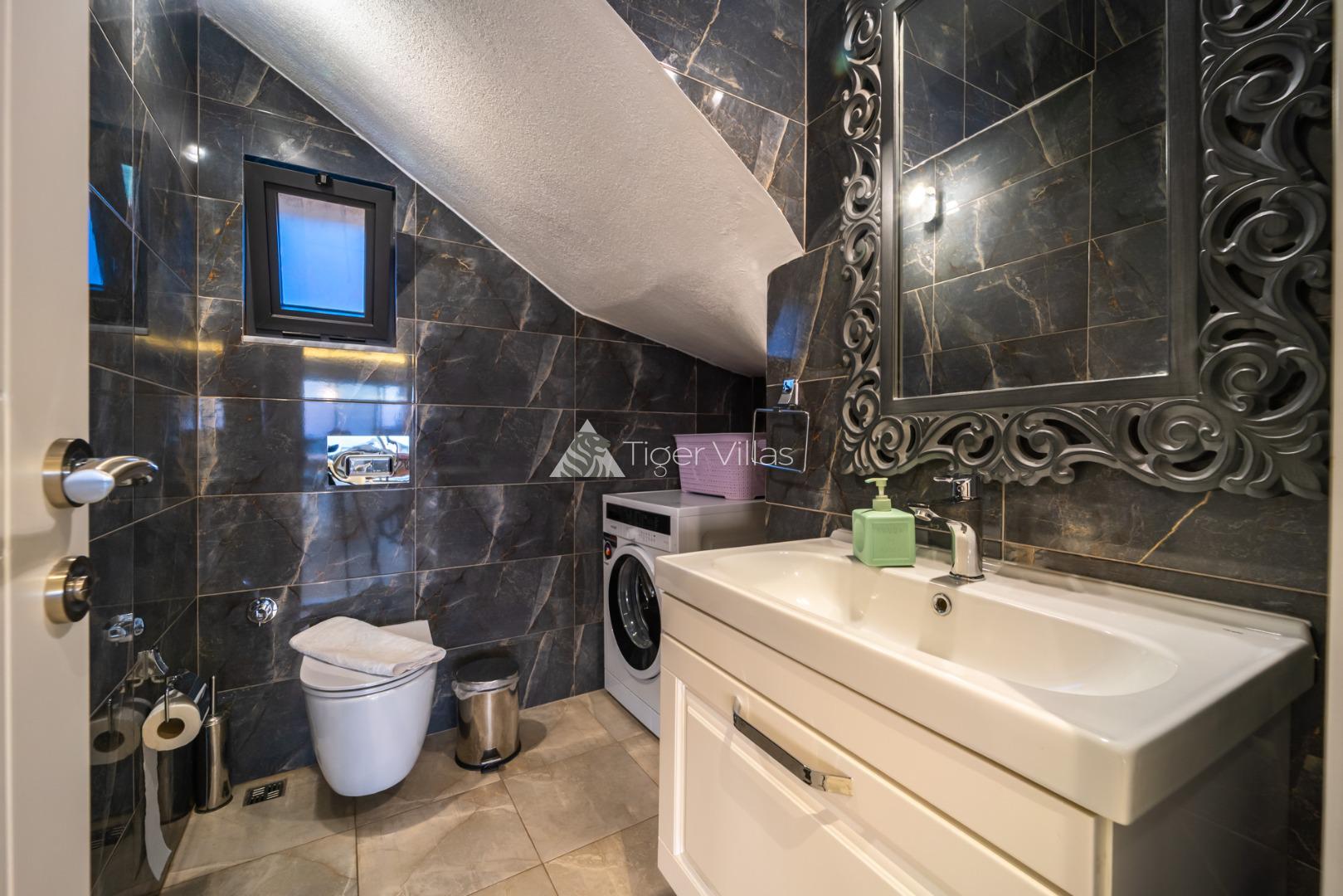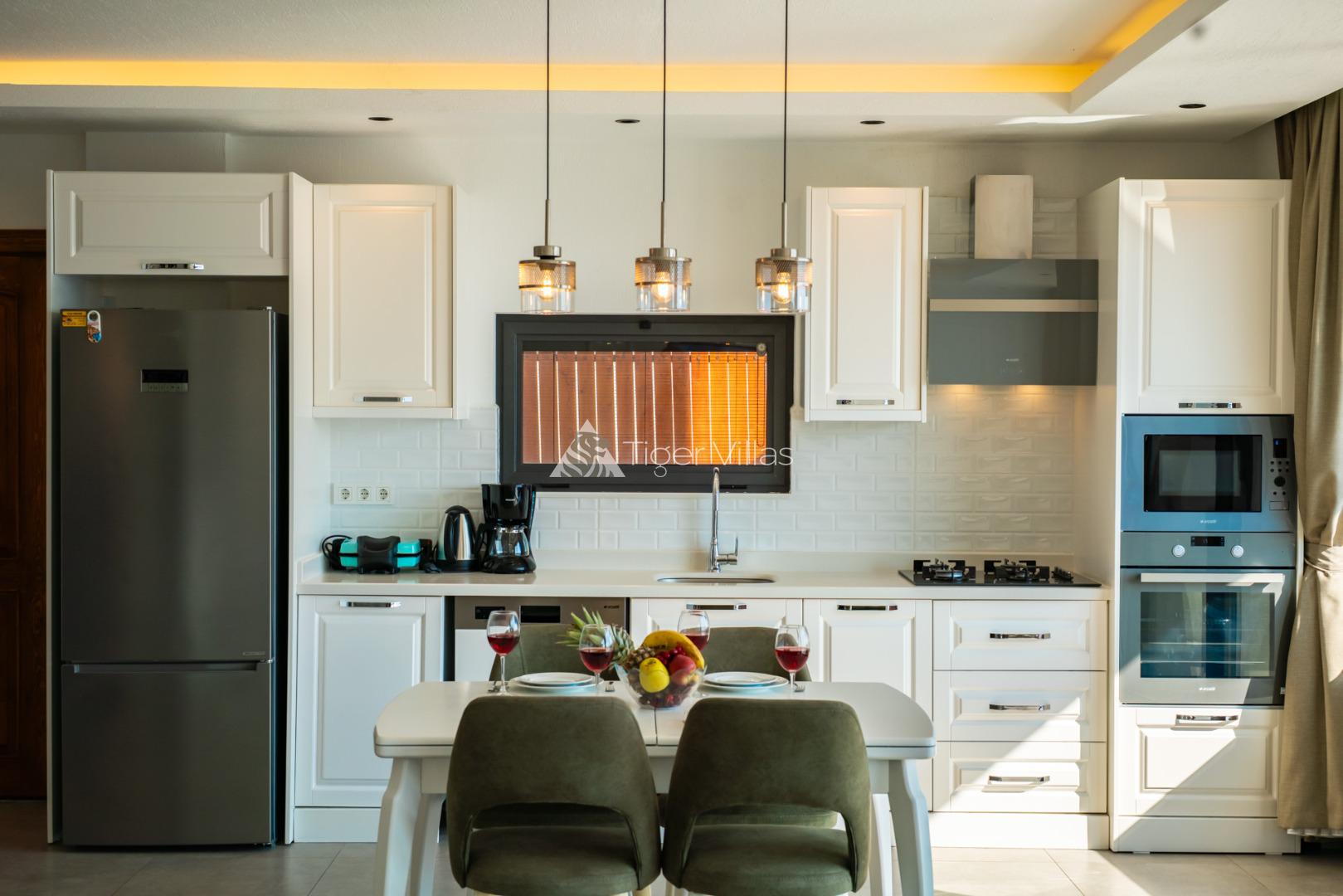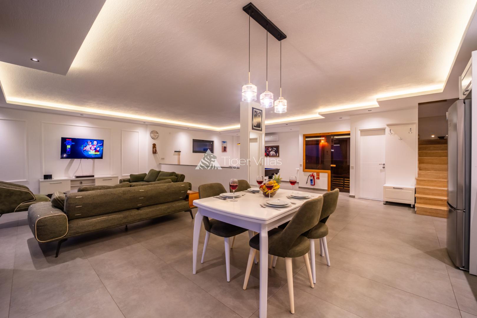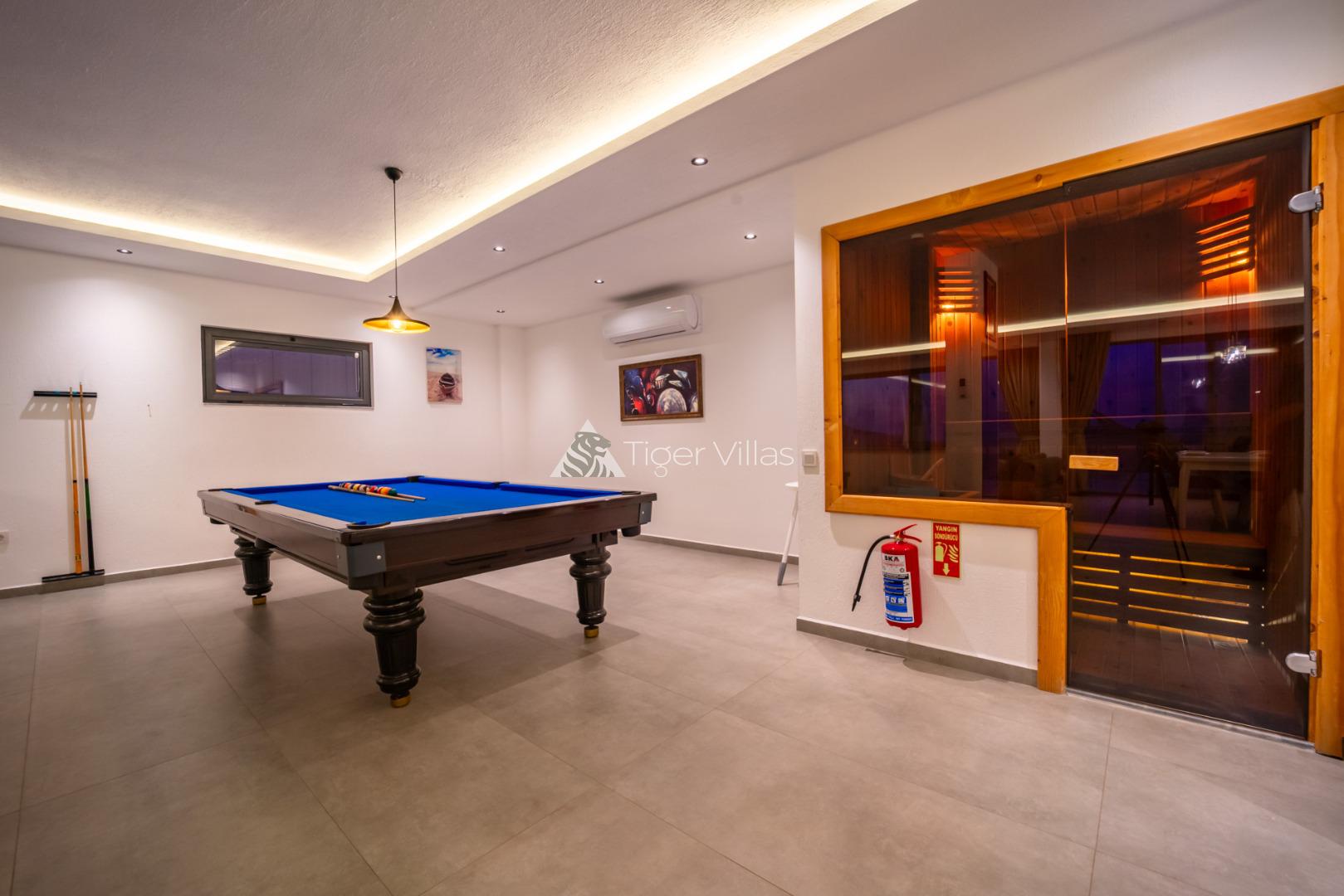 Our villa for rent, which is designed for our conservative families with a sheltered pool terrace with a sea view in Kördere area of Kalkan, and ideal for a honeymoon villa, our villa with 2 bedrooms and an accommodation capacity of 4 people provides its guests with an insatiable holiday pleasure. There is a private heated jacuzzi in both rooms of our villa. Our villa is invisible from the outside, so you can enjoy swimming with your family and having dinner by the pool against the sea view. It has been designed with a living room and an American kitchen on the ground floor. You will feel at home in the living room and kitchen, which are fully furnished with luxury goods. In order to add joy to your holiday, you will enjoy an insatiable holiday with the sauna and billiards table.