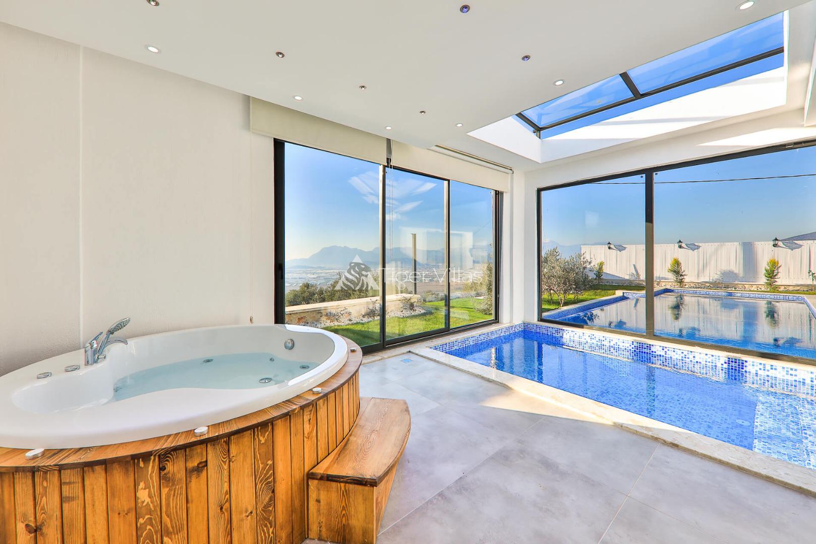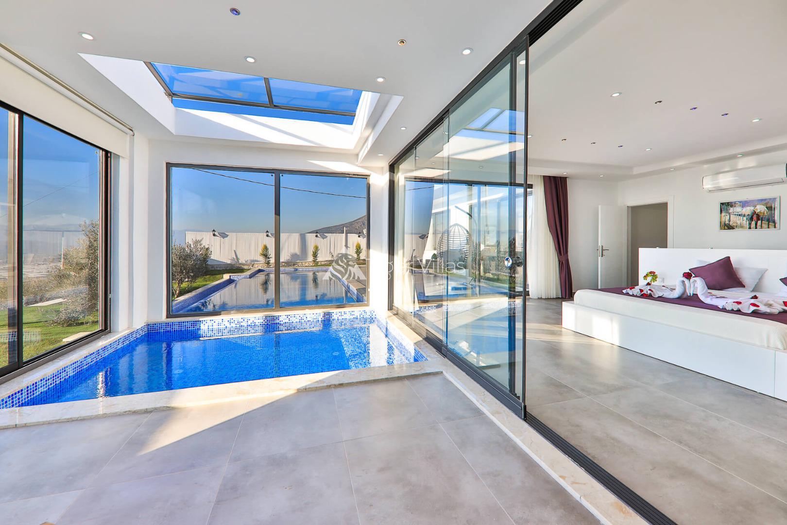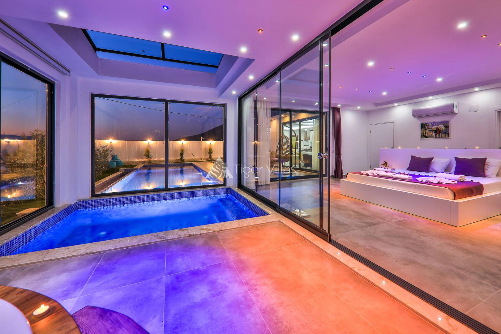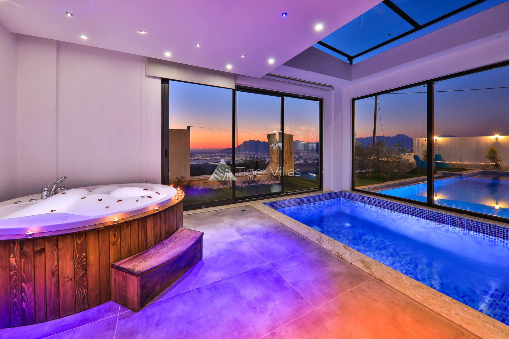 Villa Mehcan, a 1 bedroom conservative holiday villa with a capacity of 2 people located in Üzümlü village of Kalkan, Mehcan is an ideal option for our honeymoon couples who want to feel special. Villa Mehcan, whose pool and garden are not visible from the outside due to its location and the surrounding curtain system, promises a pleasant holiday in a secluded, comfortable and quiet environment. It is also frequently preferred as honeymoon villas. Villa Mehcan has been designed in a very luxurious way and has a sauna, jacuzzi, heated indoor pool and cinema room.