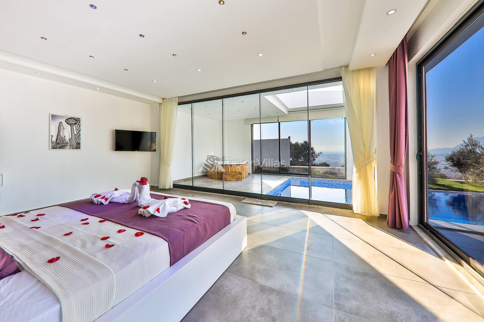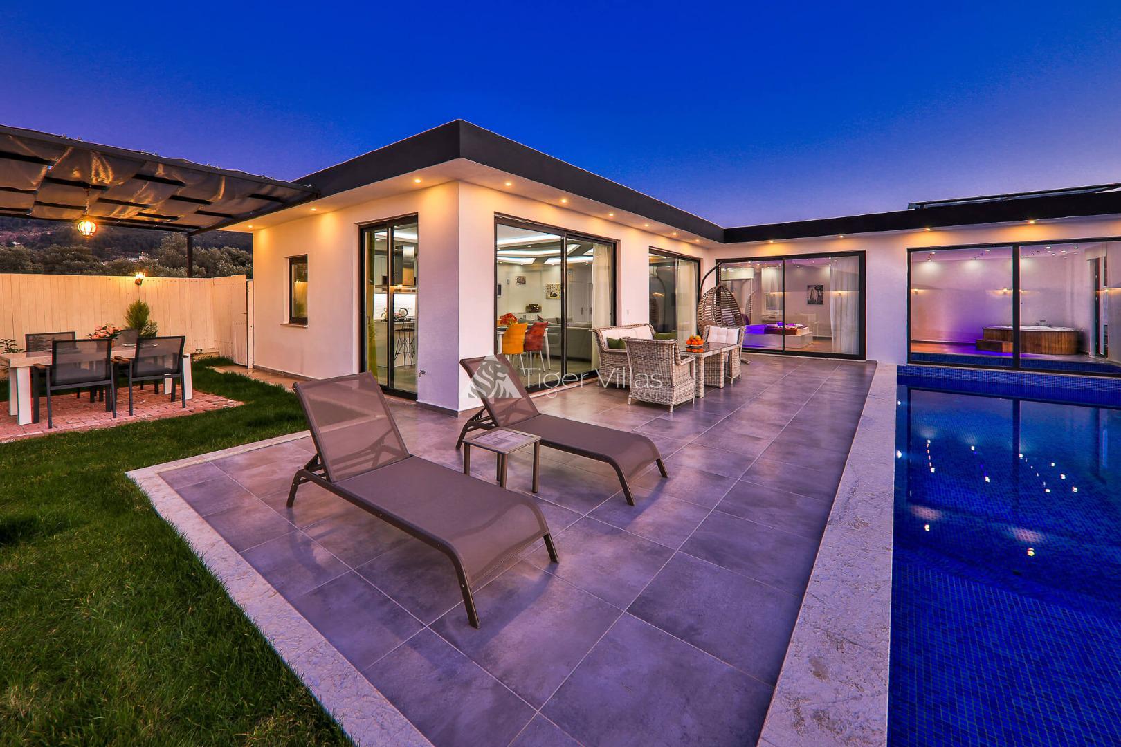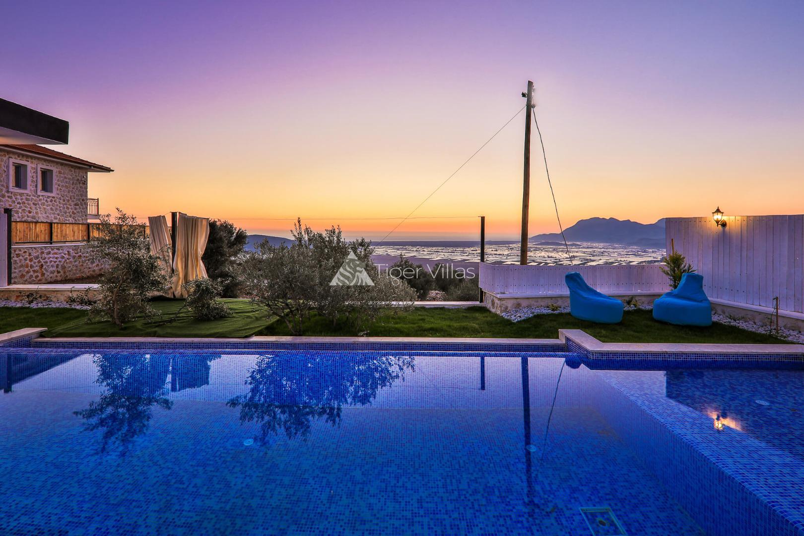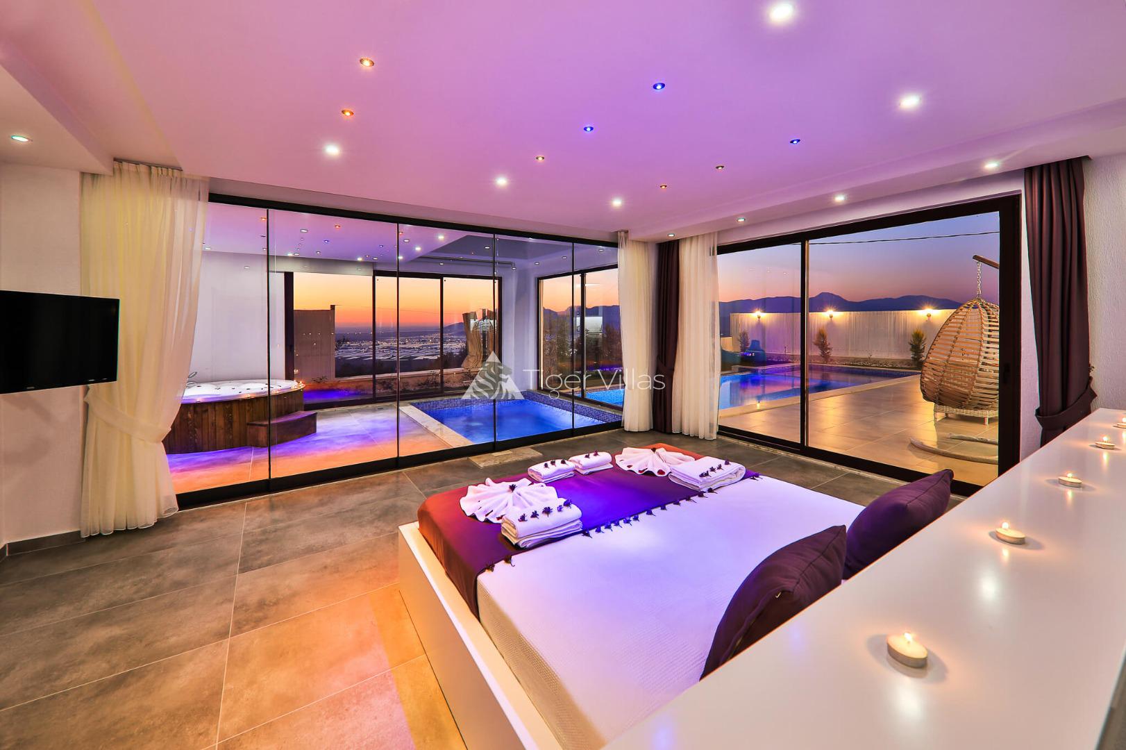 Villa Mehcan, a 1 bedroom conservative holiday villa with a capacity of 2 people located in Üzümlü village of Kalkan, Mehcan is an ideal option for our honeymoon couples who want to feel special. Villa Mehcan, whose pool and garden are not visible from the outside due to its location and the surrounding curtain system, promises a pleasant holiday in a secluded, comfortable and quiet environment. It is also frequently preferred as honeymoon villas. Villa Mehcan has been designed in a very luxurious way and has a sauna, jacuzzi, heated indoor pool and cinema room.