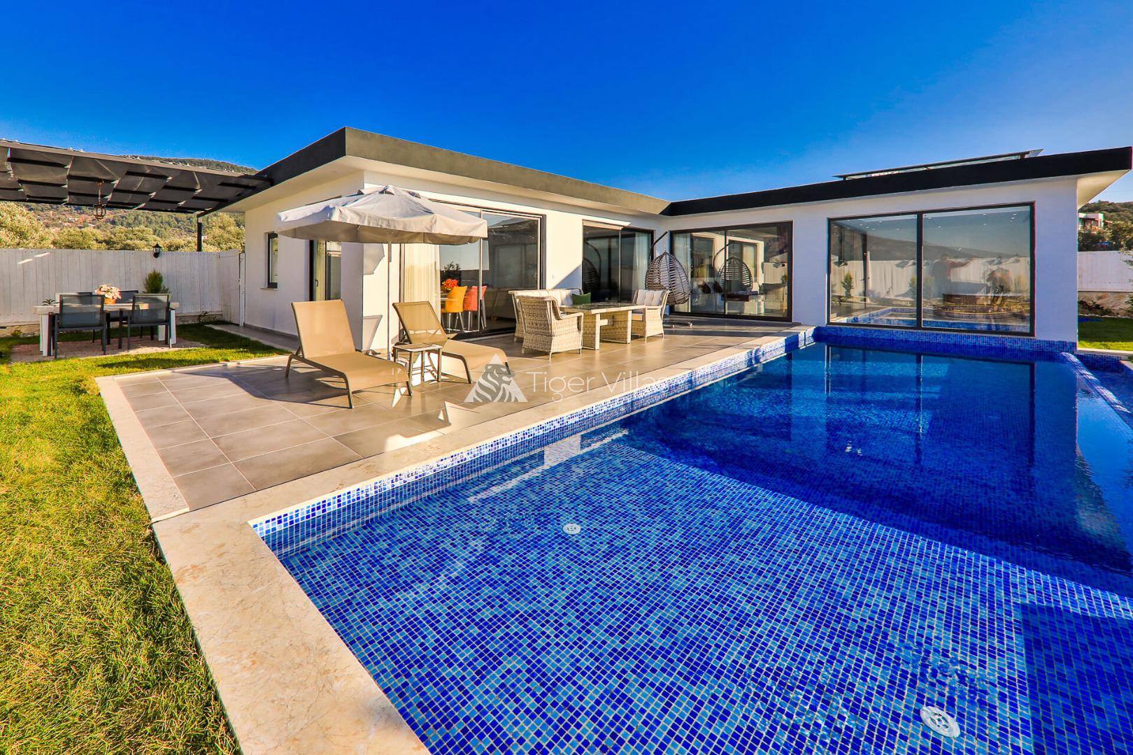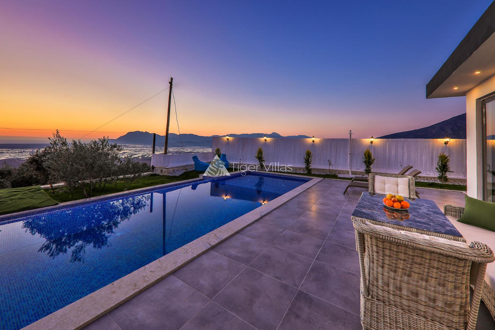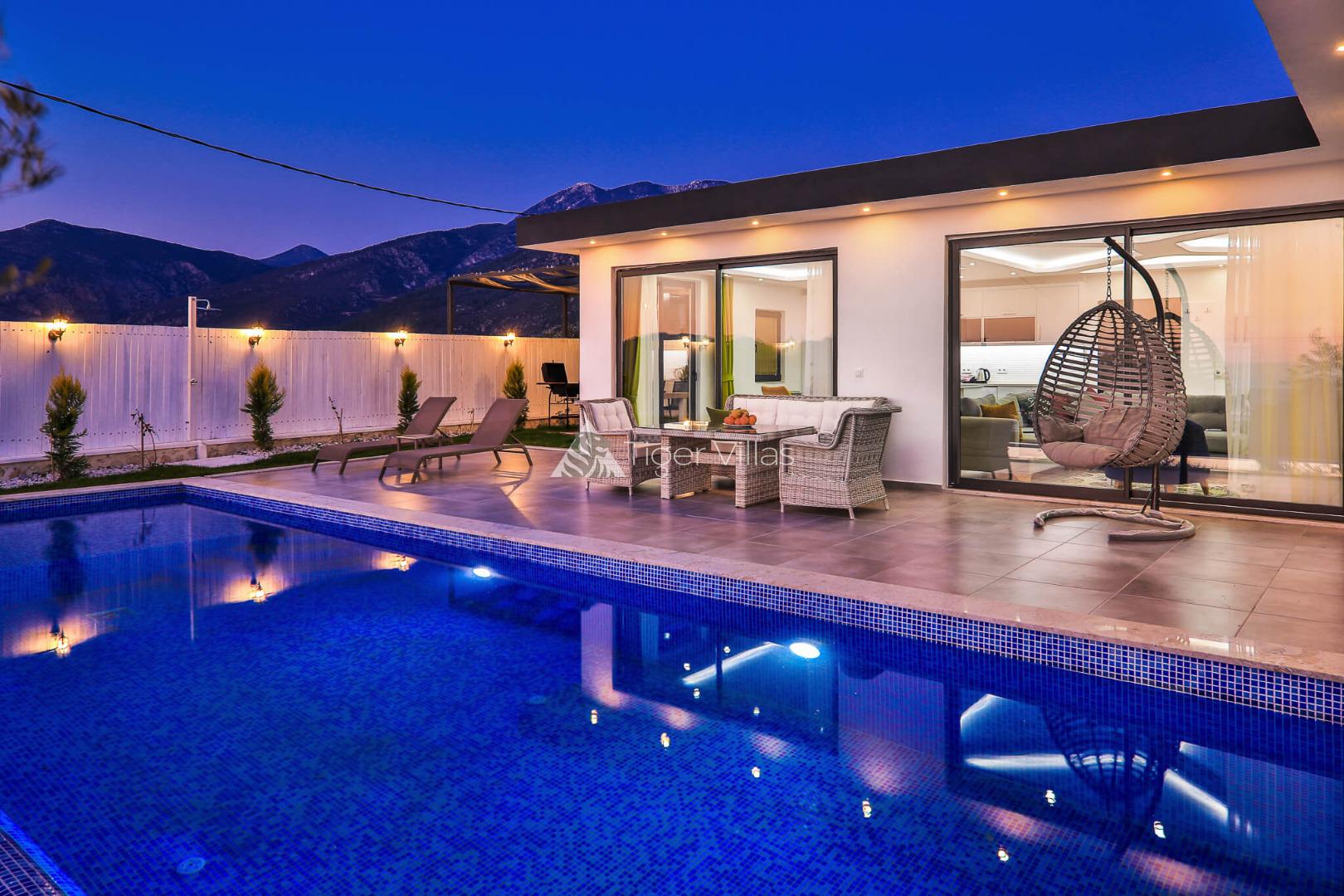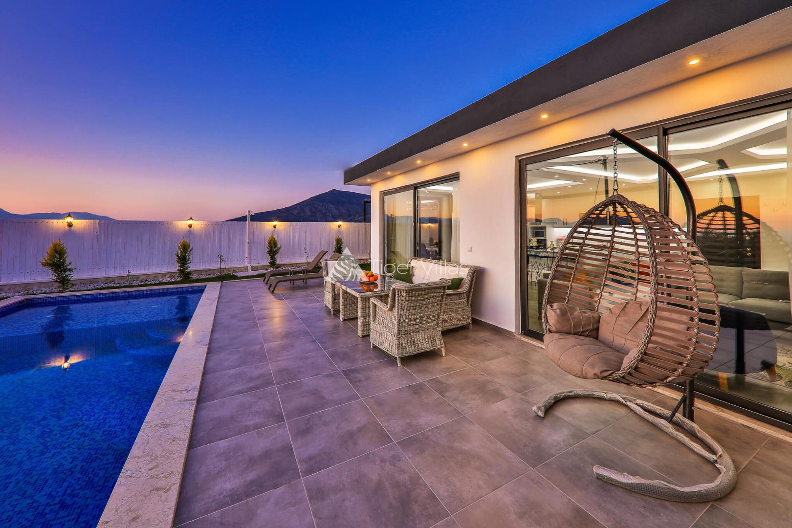 Villa Mehcan, a 1 bedroom conservative holiday villa with a capacity of 2 people located in Üzümlü village of Kalkan, Mehcan is an ideal option for our honeymoon couples who want to feel special. Villa Mehcan, whose pool and garden are not visible from the outside due to its location and the surrounding curtain system, promises a pleasant holiday in a secluded, comfortable and quiet environment. It is also frequently preferred as honeymoon villas. Villa Mehcan has been designed in a very luxurious way and has a sauna, jacuzzi, heated indoor pool and cinema room.