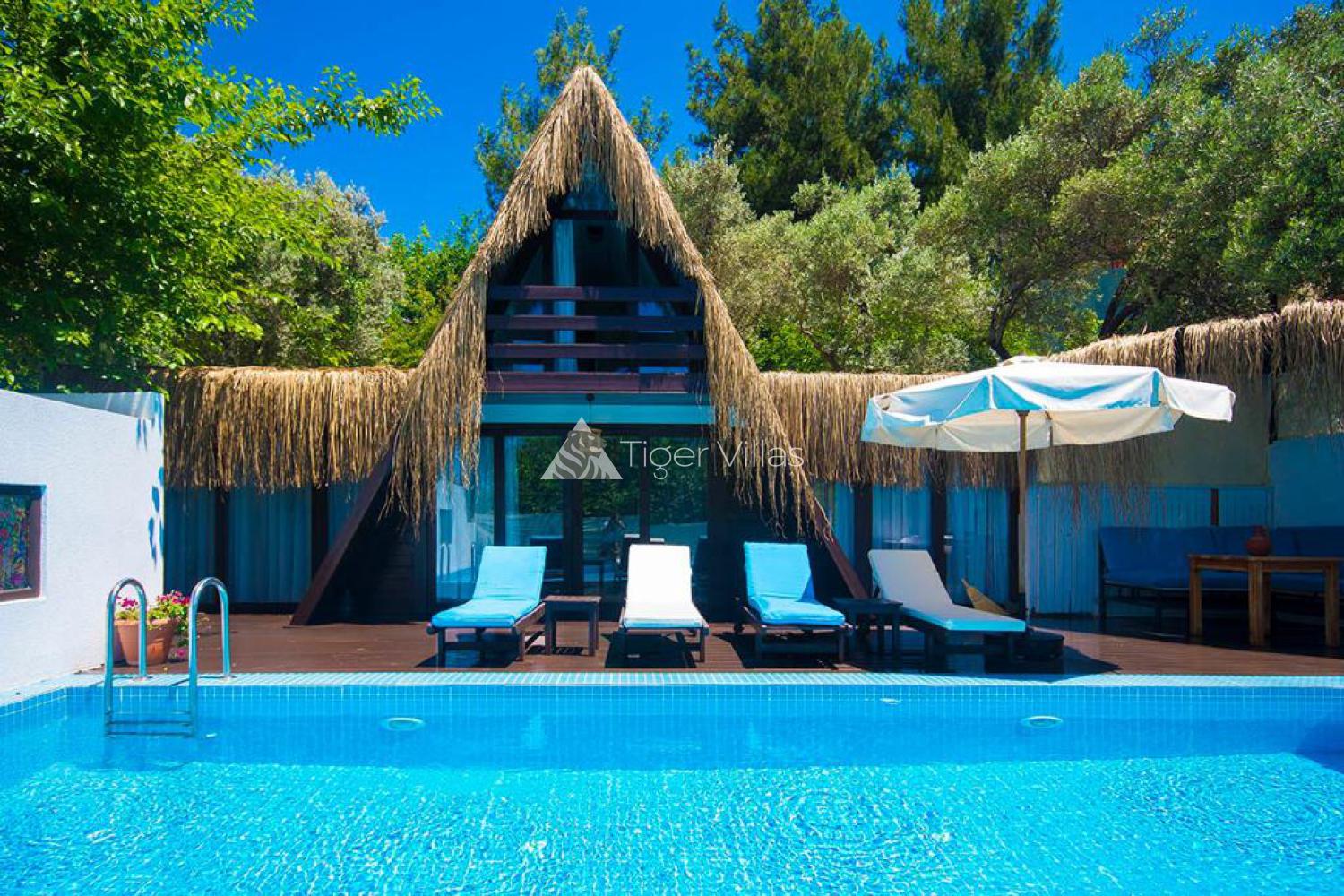 Located in Kalkan Islamlar, the villa is located in a quiet location completely in nature. The villa for rent, designed in bungolav style, has 2 suite bedrooms and a kitchen and living room. In the garden area, there is a jacuzzi, barbecue, sun loungers and parasols. The pool terrace is completely sheltered and ideal for conservative families. The villa, which is also preferred for honeymoon, is 10-15 minutes' drive from the center of Kalkan by car.- Check-in Time: 16:00Check-out time: 10:00