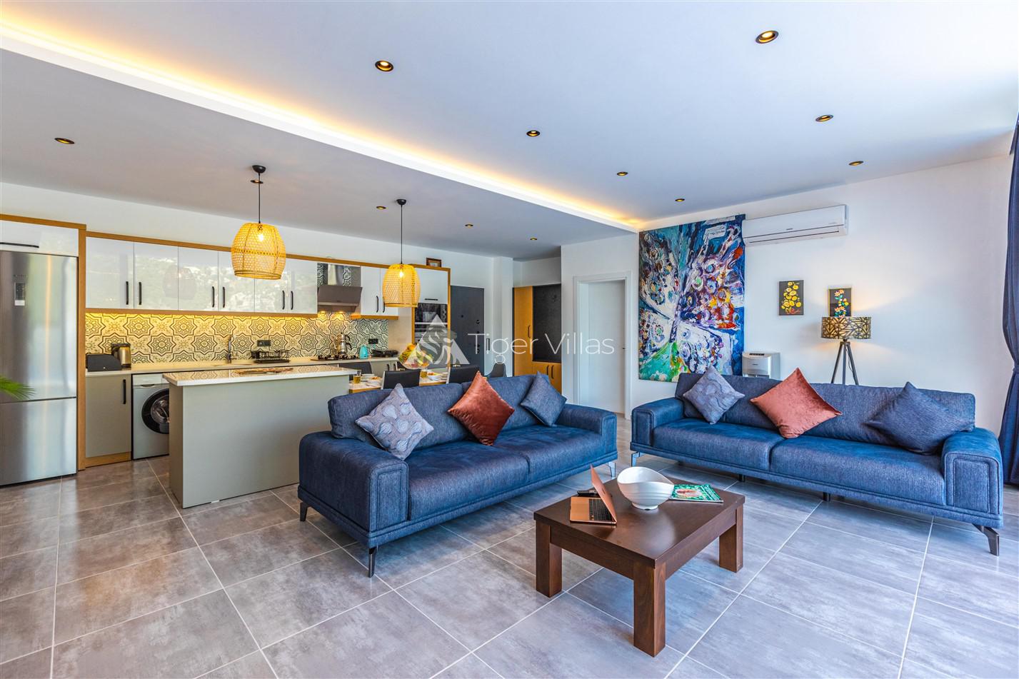 Located in Kalkan Islamlar Village, the summer villa has 2 bedrooms and has an accommodation capacity of 4 people. The pool terrace of the rental villa, which is in a quiet location in nature, is completely sheltered and is not visible from the outside. The villa, which is suitable for both honeymooners and families with children, also has a jacuzzi. At the same time, the American kitchen and living room, where all kitchen tools are located, are designed very comfortably. The summer villa is located within a 10-minute drive from the center of Kalkan.- Check-in Time: 16:00Check-out time: 10:00