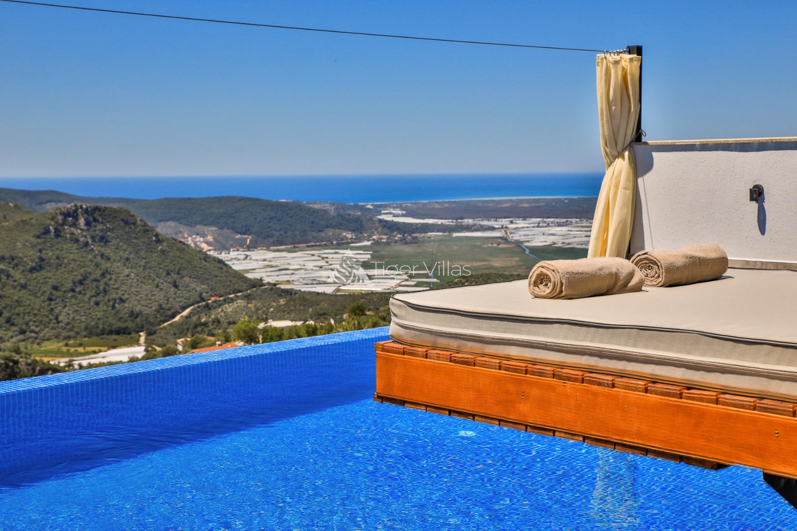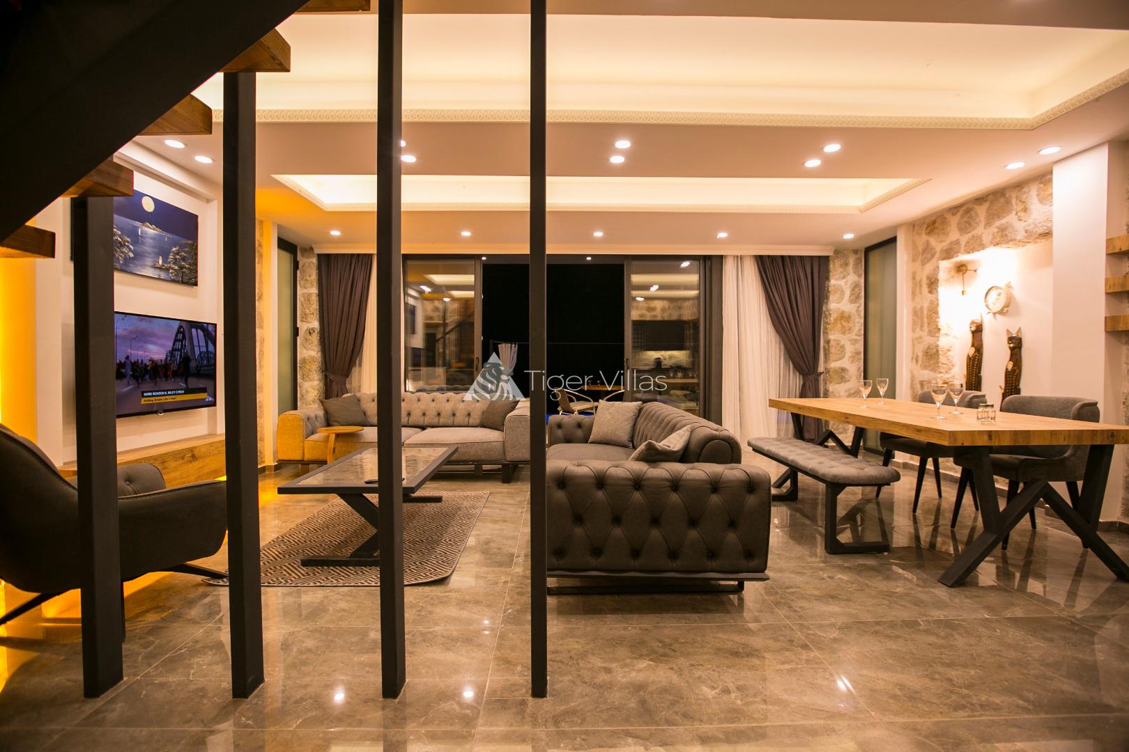 Villa Nil Exclusive has an excellent sea view in Kalkan-Üzümlü village and it is one of our options for nuclear families and honeymoon couples. The olive trees around this villa, leaning its back against the Taurus Mountains, cleanse the atmosphere, prevent the overwhelming moisture in summer and maximize the oxygen in the region. In this way, Villa Nil Exclusive opens the doors of a healthy holiday to its guests. This villa, whose construction was completed in 2020, is new and luxurious. Everything is thought for your comfort in our villa furnished with luxury furniture. The left and right sides of the pool terrace of this luxury villa are sheltered as shown in the pictures and have been made suitable for families. Designed to appeal to our guests who care about privacy, this villa is one of our privileged honeymoon villas. Also, the front side of the pool of our villa can be 100% protected with a system that can be opened and closed with a screening system if requested by our guests. In this sense, an unforgettable holiday awaits you in this luxury villa, which is made suitable for nuclear families with a secluded holiday understanding or for holidaymakers who prefer a sheltered holiday.
