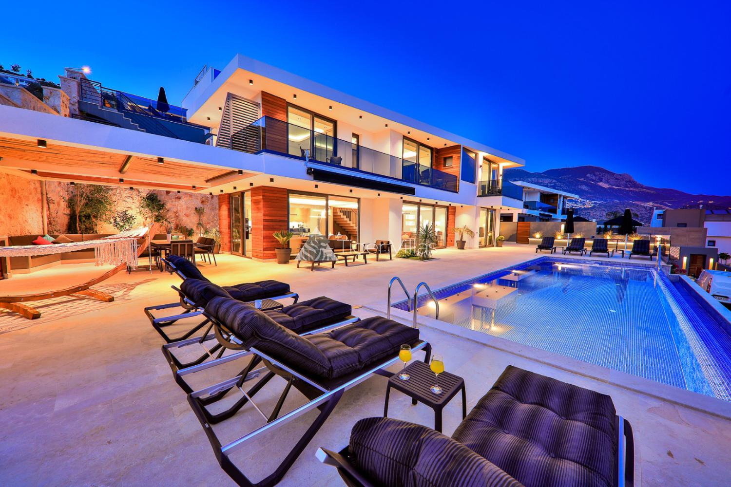 Luxury Villa Nymphe for rent, close to the center and the sea, has 4 bedrooms and can accommodate 8 people. Our rental villa with jacuzzi, where you can spend a peaceful and enjoyable holiday with your loved ones, is among our options suitable for crowded families and groups of friends. All of the items used in our luxury rental villa, which has been designed in a modern and comfortable way in order to offer you a perfect holiday, are of first quality. All the rooms of our villa are prepared in the en suite style and have a bright and spacious structure. The garden floor is large and large, with a private swimming pool, sitting area and dining area. Our luxury villa for rent with sea view is located approximately 1 km from Kalkan center and the beach.