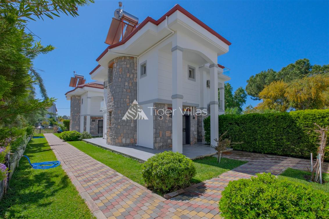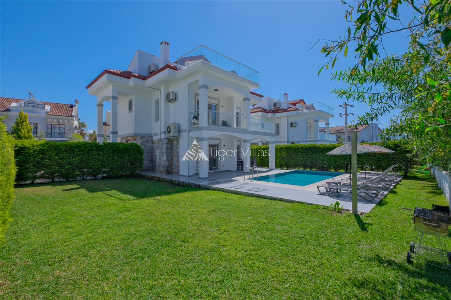 Our luxury rental villa with private swimming pool, located close to Fethiye Koca Calis Beach, has a total accommodation capacity of 7 people. Our villa is located 5.5 km from the center of Fethiye and the closest walking distance to Koca Calis Beach is 750 meters. Our villa has a magnificent garden surrounded by greenery, a sunbathing area, sun loungers, umbrellas, dining table, private swimming pool and barbecue in the garden. There are 3 villas in total and it will be an ideal choice for crowded groups and families. Dalaman Airport is approximately 45 km from our villa.