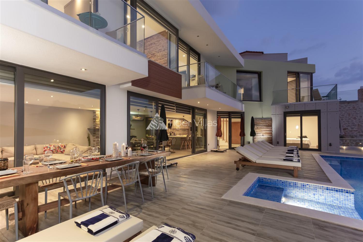Located in the calamari region, 2 km from Kalkan city center, with an accommodation capacity of 8 people in 4 bedrooms, with a magnificent sea view, suitable for large families and groups of friends, our rental villa has a private heated jacuzzi in one bedroom. Our villa, which has a luxurious and modern structure, also includes a pool table.