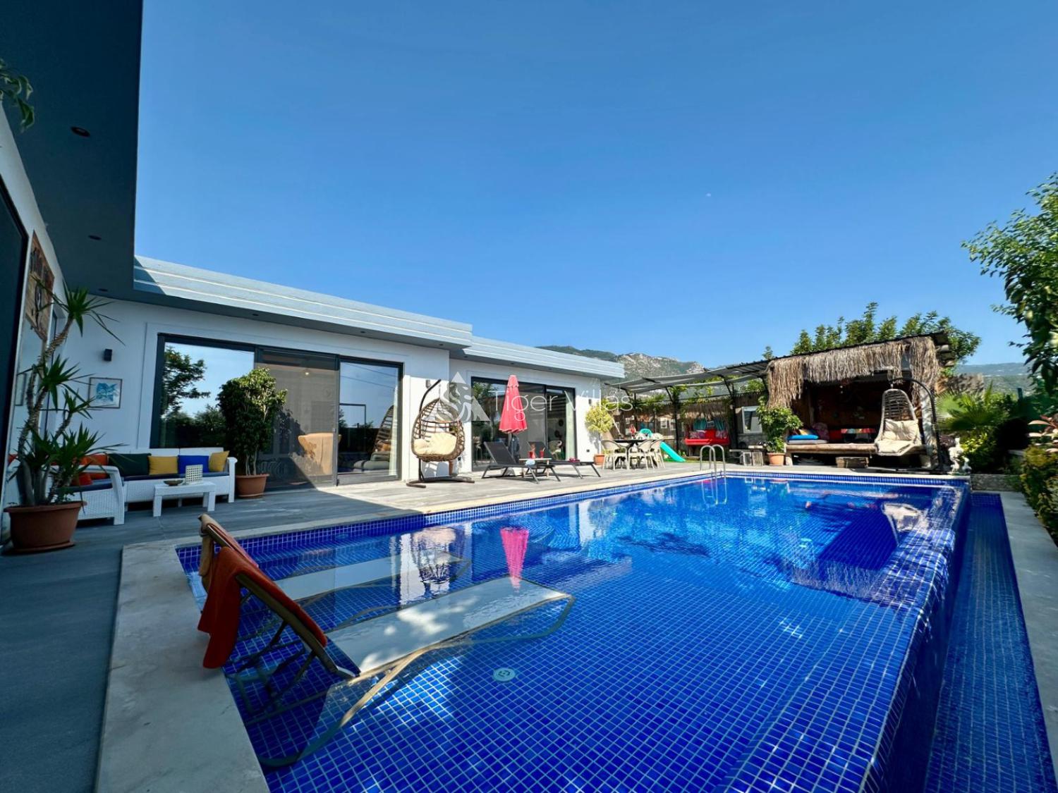 Pool and Garden: The private swimming pool of our villa is conservative and it is definitely not visible from the outside. There are sun loungers, umbrellas, dining table, barbecue. There is a swing.