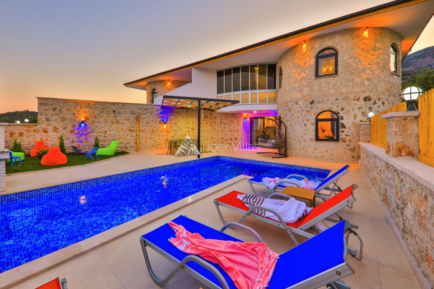 The luxury villa for rent in Kalkan Karadere village is a very suitable option for our families who want a peaceful holiday with their loved ones in a quiet location. Our villa, which is in the category of conservative villas and villas with jacuzzis, has 3 bedrooms and an accommodation capacity of 6 people. Villa Sanak 1, whose pool is sheltered and whose garden is not visible from the outside, offers a peaceful holiday opportunity for your families and groups of friends who value privacy. In addition, an unforgettable holiday awaits you in our villa, which has a large garden, Turkish bath, sauna and indoor pool.