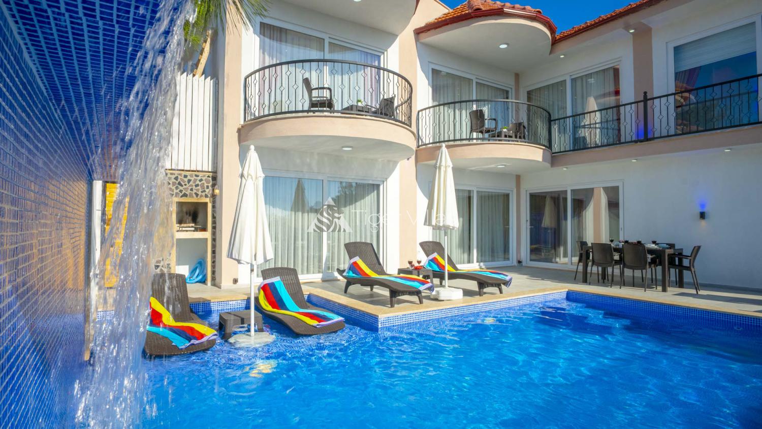 Villa Saral, which is only 3 km away from the city center, is located in the Kalkan region. Our villa, which is included in our Honeymoon Villas and Conservative Villas options with an accommodation capacity of 2 bedrooms for 4 people, has been carefully designed and includes an indoor heated pool and a movie theater. The villa for rent with a private pool is also suitable for conservative families, and the pool terrace is sheltered.