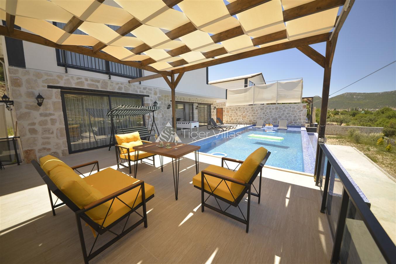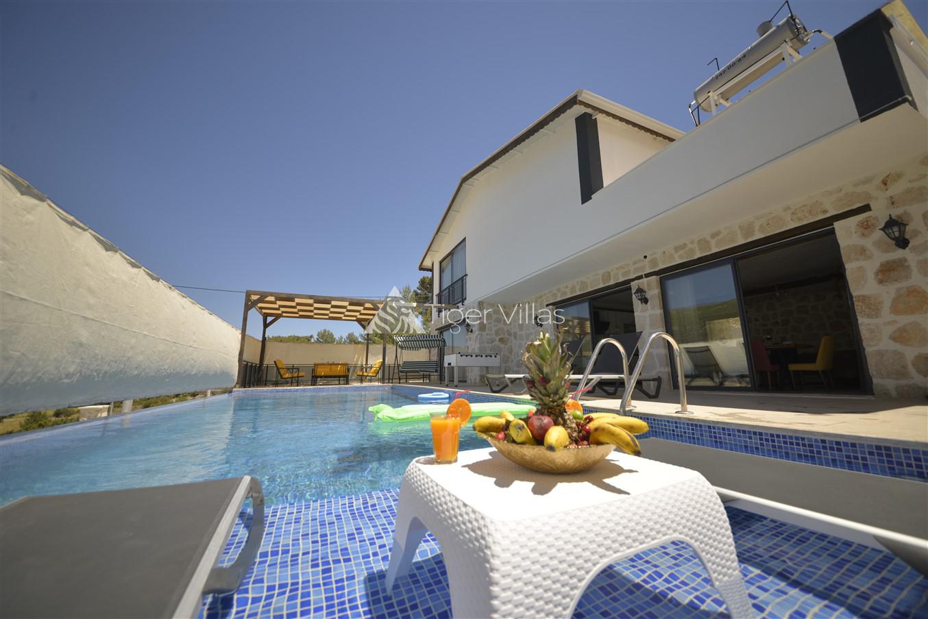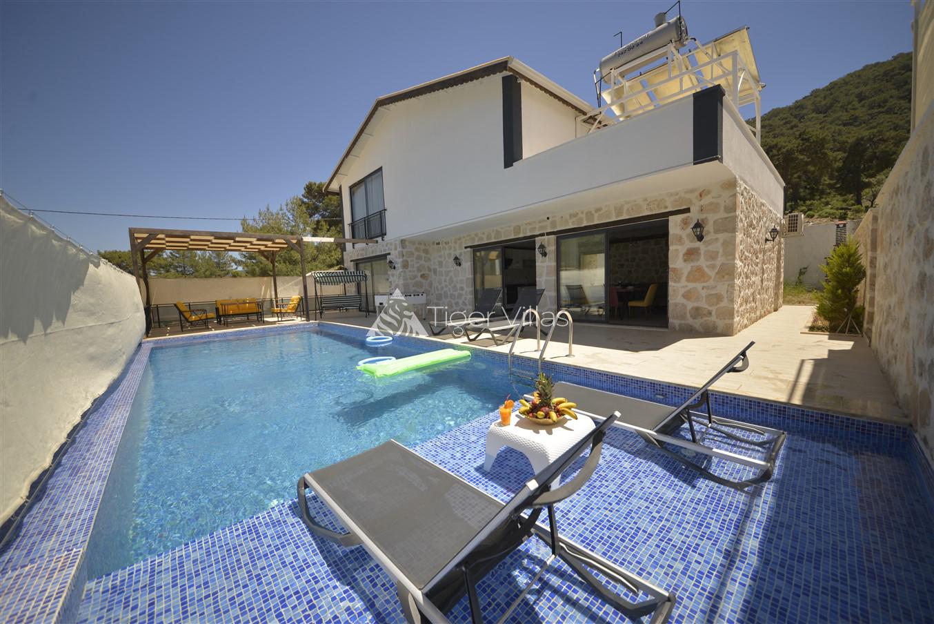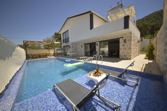 Villa Sehlen is located in Kalkan Sarıbelen region. Our 3-bedroom villa can accommodate 6 people. The pool terrace of Villa Sehle is sheltered. It is quite suitable for conservative families and couples.
