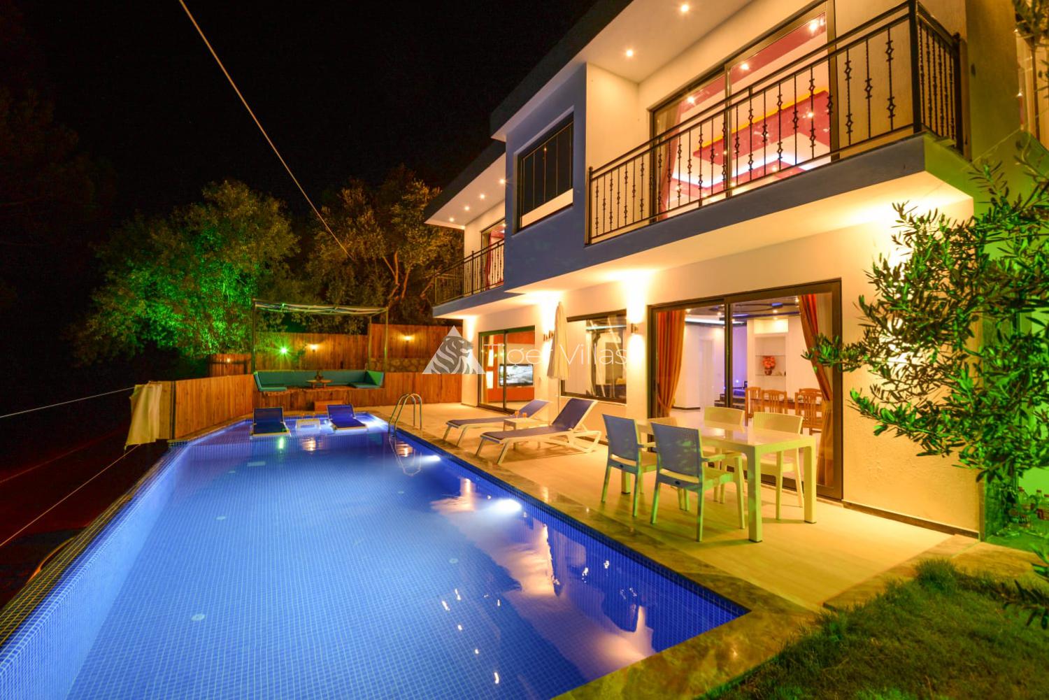 Our rental villa, located in the nature of Yeşilköy, Kalkan, has a 2-bedroom accommodation capacity for 4 people. 1 of our bedrooms have double beds and 1 of them has 2 separate beds. Our bedrooms have a private heated jacuzzi. The double bedroom has a private heated jacuzzi. The pool terrace of our villa, which has a large pool terrace, is designed with sun loungers, dining table, swing and sitting corner. Our villa, which has a modern and comfortable structure, has been designed considering all the possibilities to meet all the needs of our guests. There is a sauna in our villa.