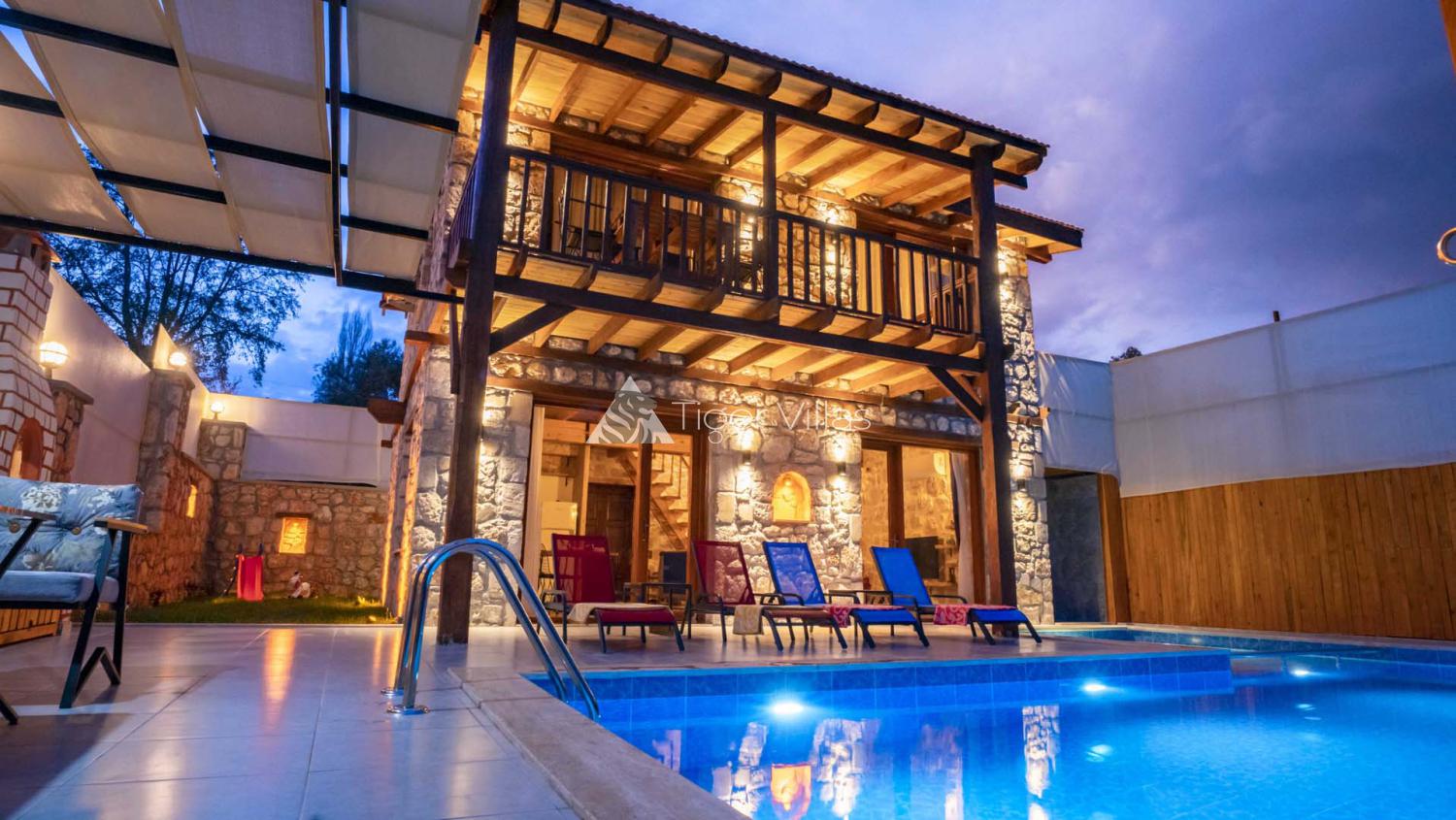 Villa Senir is located in Kalkan Sarıbelen region. It has an accommodation capacity of 4 people with 2 bedrooms. Our villa, where stone and wooden architecture complement each other and create a visual feast, is in the conservative villas category because the pool area is sheltered. There is a children's pool and a mini playground in the pool area of our villa located in nature. Jacuzzi is also provided in the suite bedroom of our villa, where every detail is considered so that our esteemed guests can feel comfortable. Our villa, which offers the opportunity to have a holiday in a stylish, simple and spacious atmosphere, will be an ideal choice for our honeymoon couples and nuclear families.- Check-in Time: 16:00Check-out time: 10:00