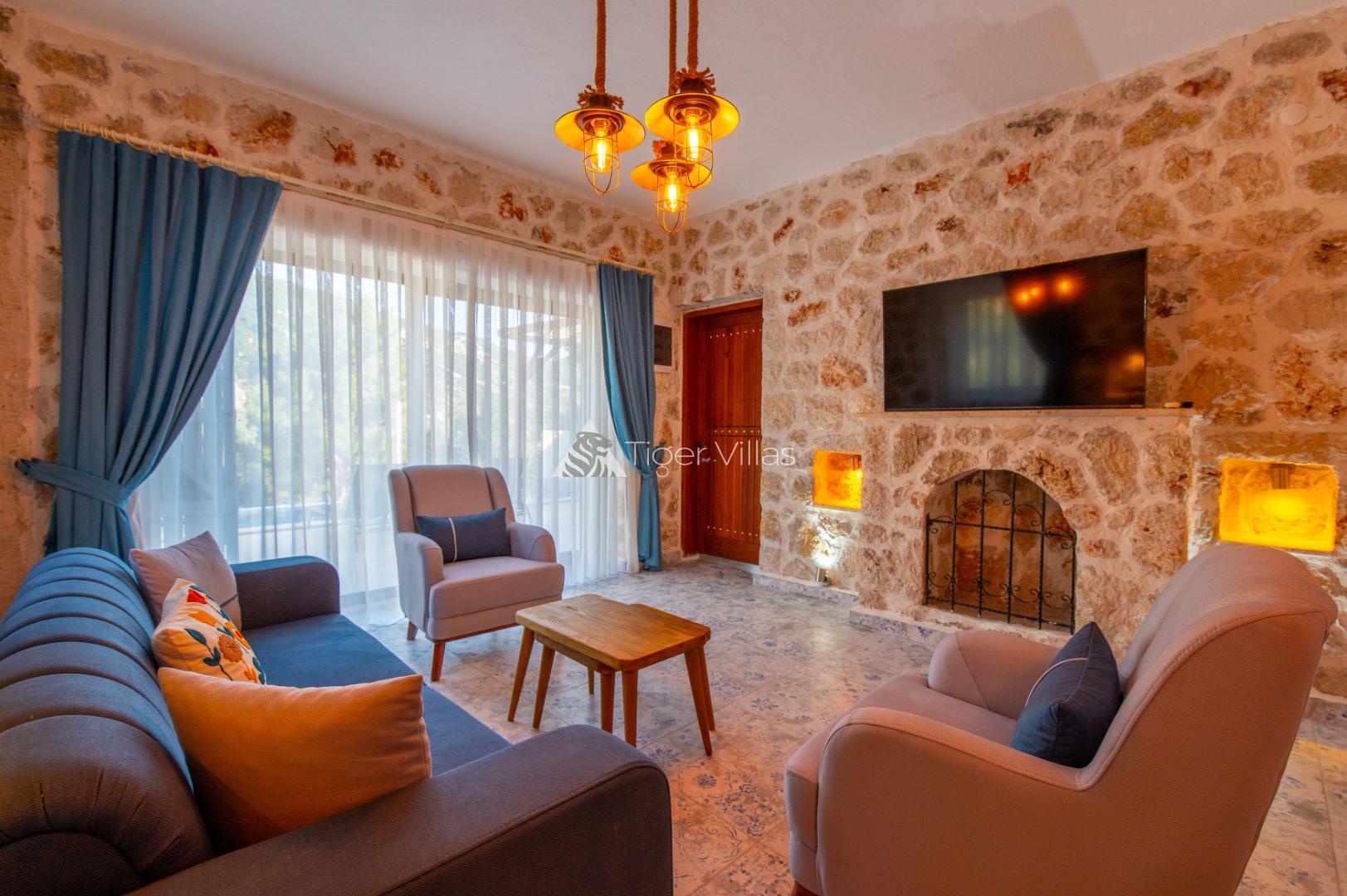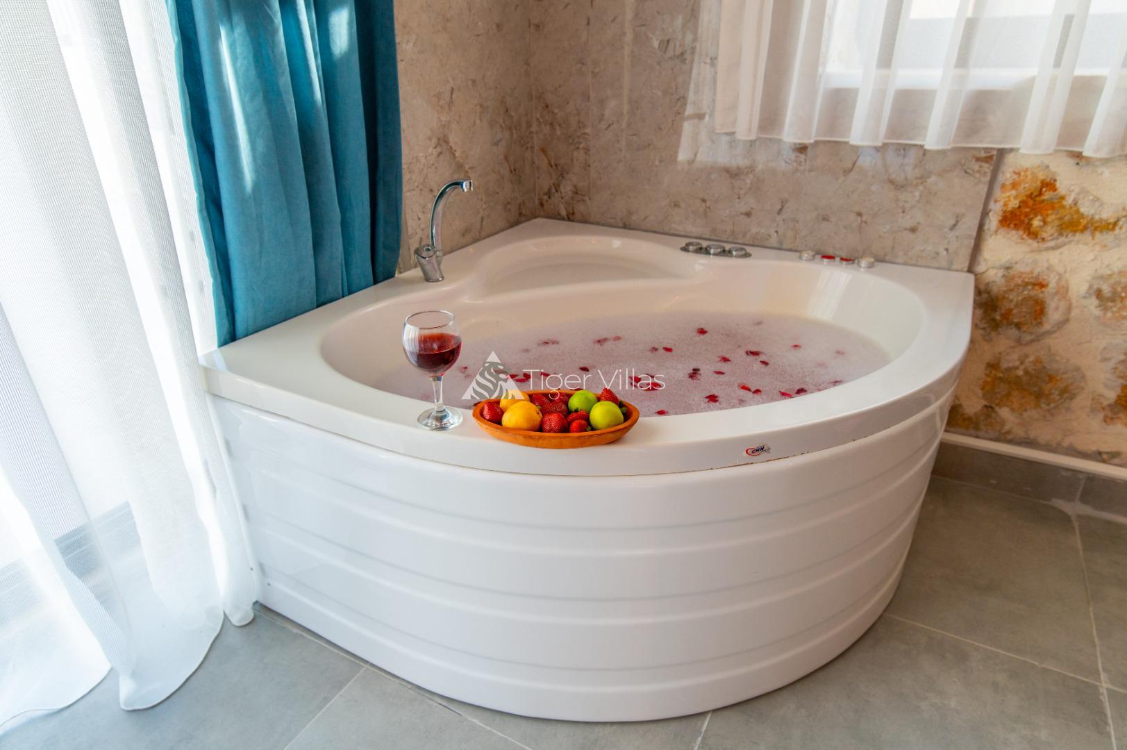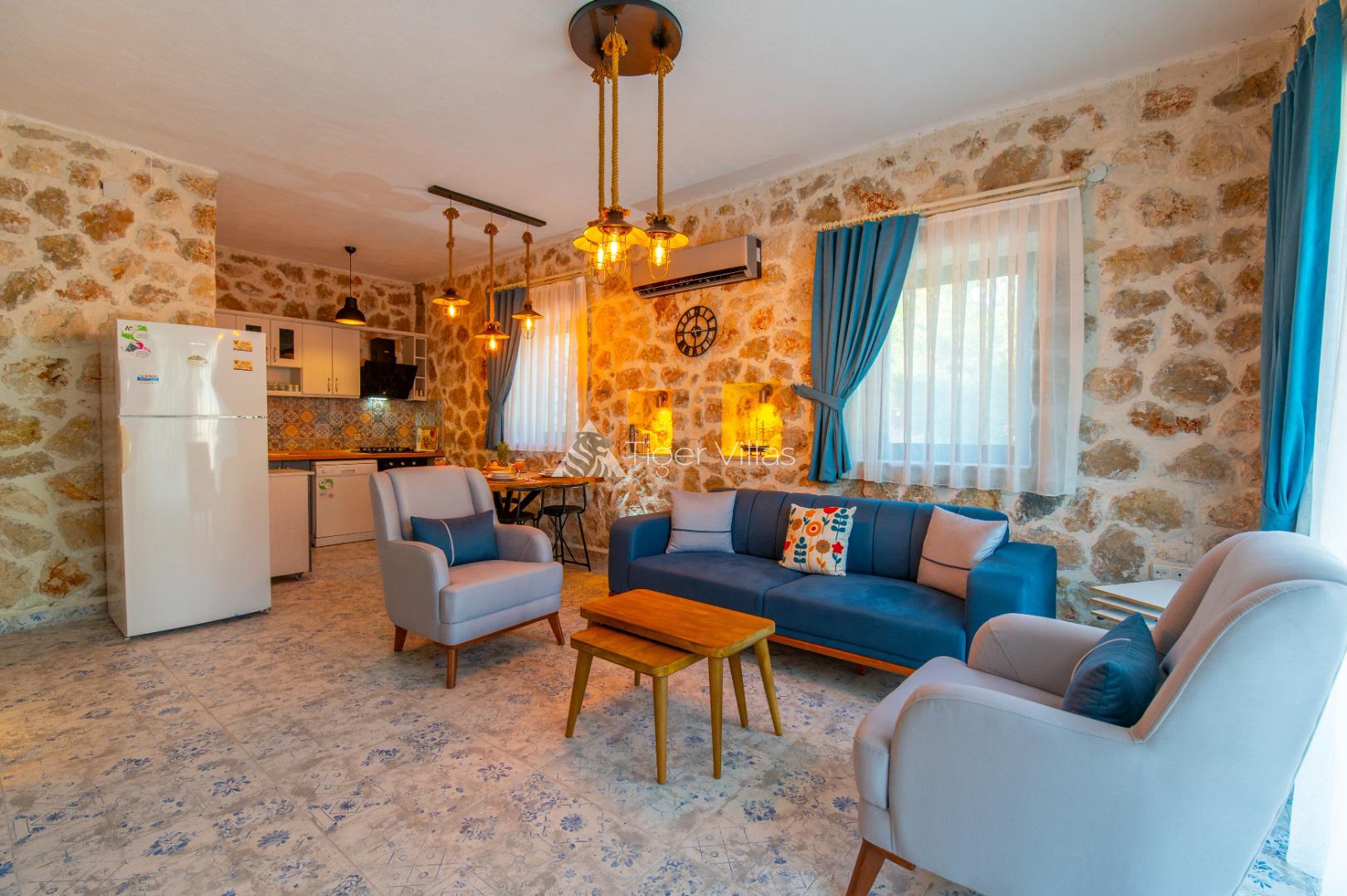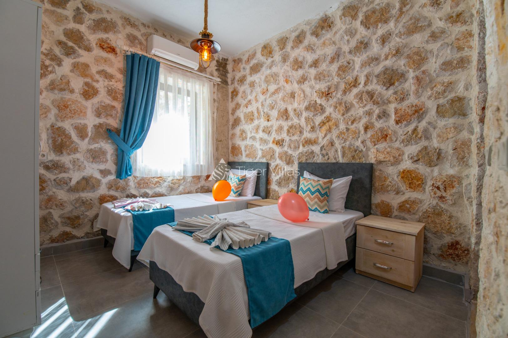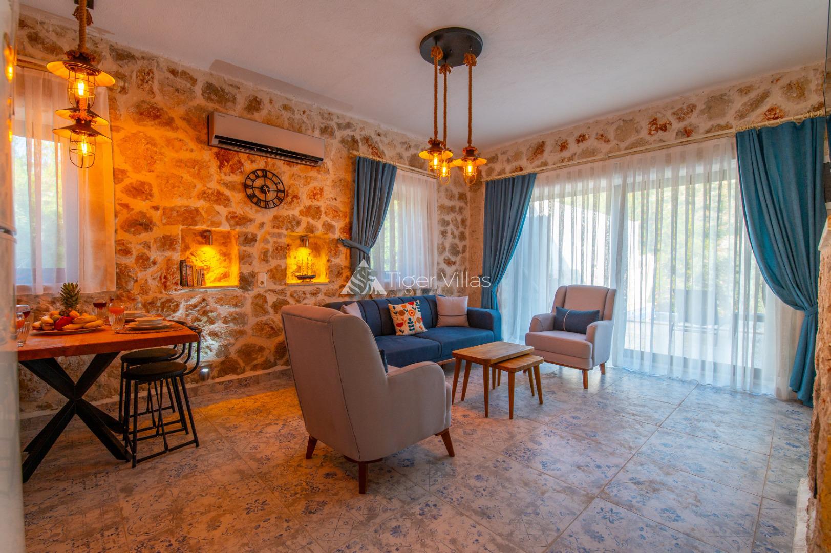 Summer Rental Villa Stone House 2, in the Islamlar area of Kalkan, with a 2-bedroom capacity for 4 people, our villa is in our options of Conservative Villas, Villas with Jacuzzi and Honeymoon Villas, our villa is ideal for families and couples looking for a conservative villa with stone architecture in a quiet and peaceful environment. It is also preferred by honeymoon couples. There is a jacuzzi in the master bedroom of our villa.