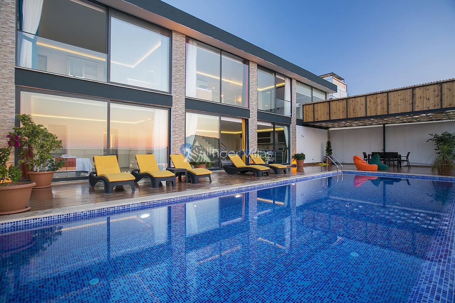 Located in the village of Üzümlü in Kalkan and included in our Secluded Villas, Villas with Jacuzzi and Honeymoon Villas, Villa Suare has a capacity of 6 people with 3 bedrooms. There is a suite bedroom, kitchen and living room on the ground floor of our villa. One of the two bedrooms on the upper floor has a jacuzzi and a heated indoor pool, and the other has a jacuzzi. In our villa, which has a panoramic view of Patara beach, a secluded pleasant and peaceful holiday awaits you.