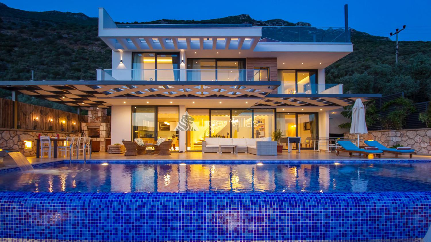 Villa Topcu Duo (sleeps 10) is a contemporary, luxury, air-conditioned villa with 5 bedrooms each with it's own en-suite and four have their own private balcony with amazing sea view. The villa is situated just a 15 minute stroll from the centre of the enchanting Kalkan town and harbour.(3 min. by driving.)