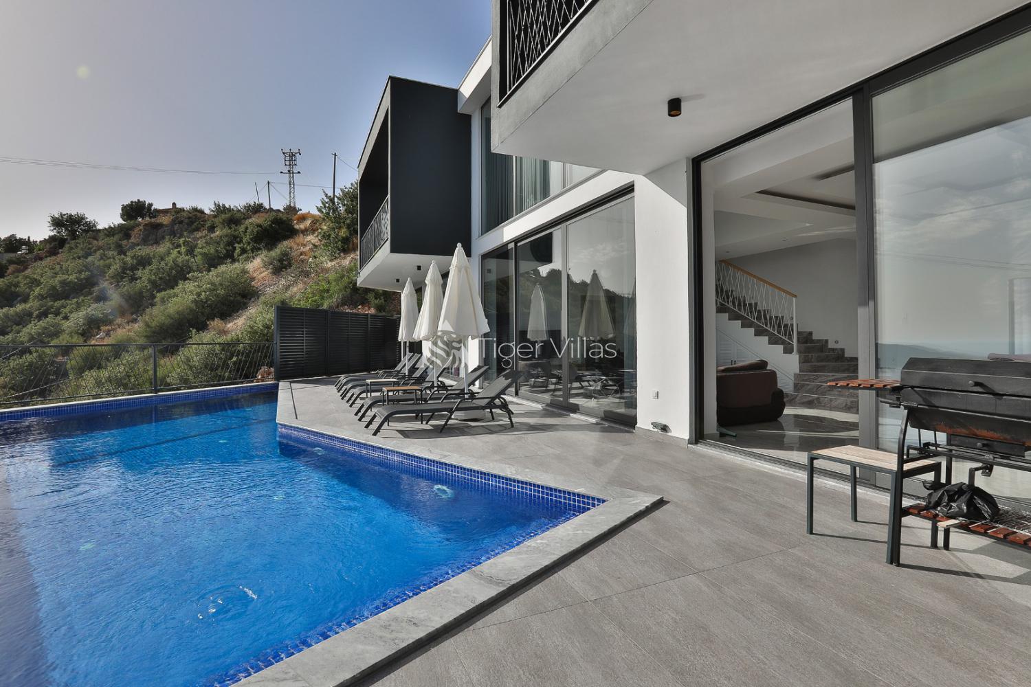 Our rental villa in Kördere, Kalkan, with nature and sea views that will relieve the tiredness of the whole year, has a 3-bedroom accommodation capacity for 6 people. 2 bedrooms are double and 1 bedroom has 2 single beds. There is a private heated jacuzzi in one bedroom of our villa. Our villa, which has a luxurious design, has been designed with every detail in mind so that our guests can experience comfort in their own homes. The pool terrace of our villa, which has a magnificent pool terrace, will offer you a peaceful holiday as it is against the sea and nature.