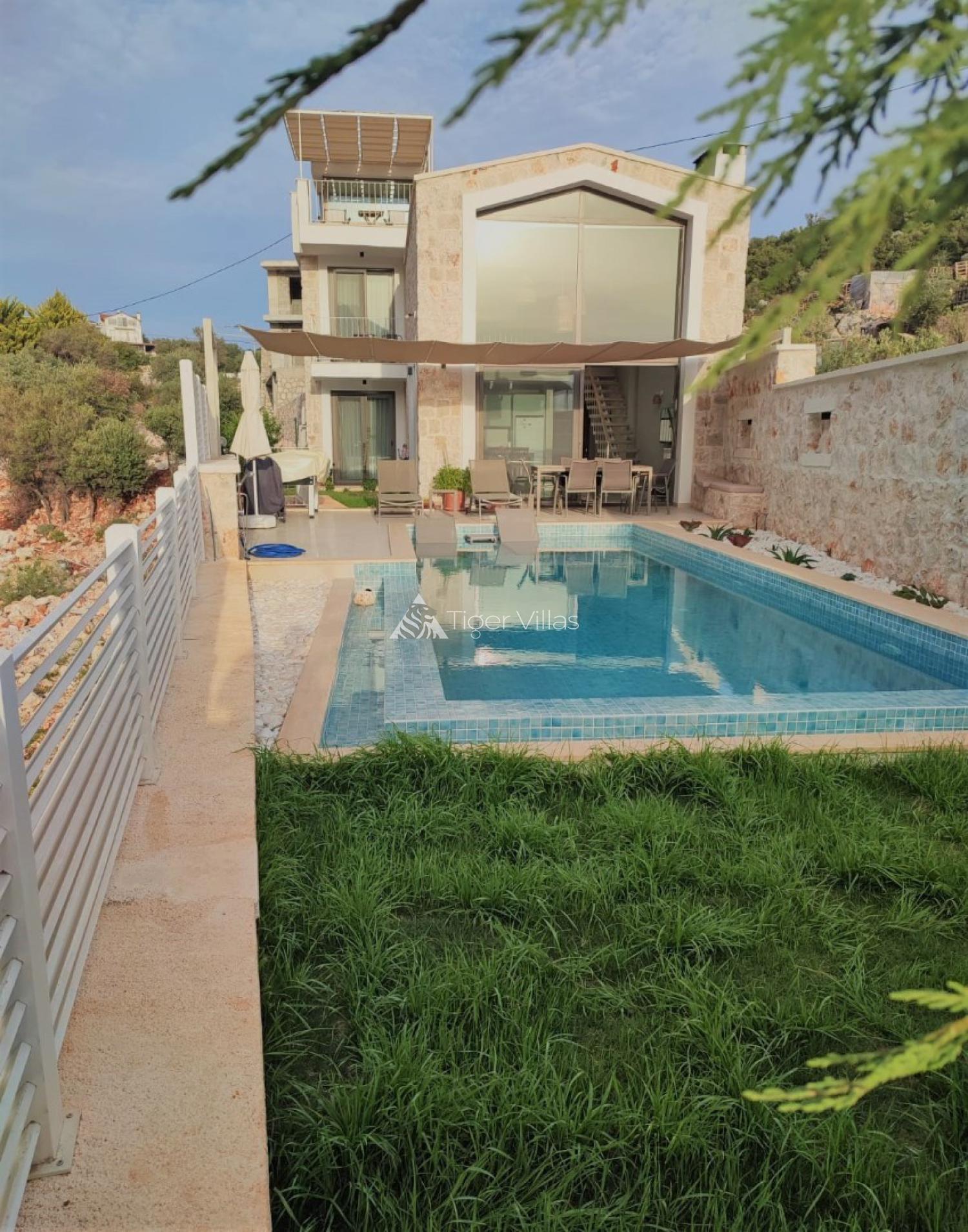 Our villa, located in Kaş Gökseki region, was put into service in July 2021. Attracting attention with its luxurious and modern design, the villa for rent has 2 bedrooms and can accommodate 4 people. Villa Vibes, which has a jacuzzi both outside and inside, is located in nature. It has a private swimming pool and a magnificent sea view. It has bedrooms designed as suites and a kitchen and living room. Rental villas, which are equipped to meet all your basic needs, offer a very comfortable holiday opportunity to our guests.