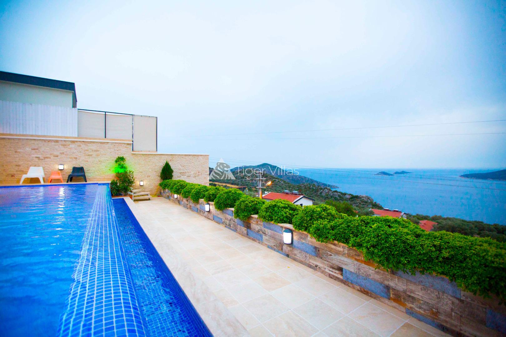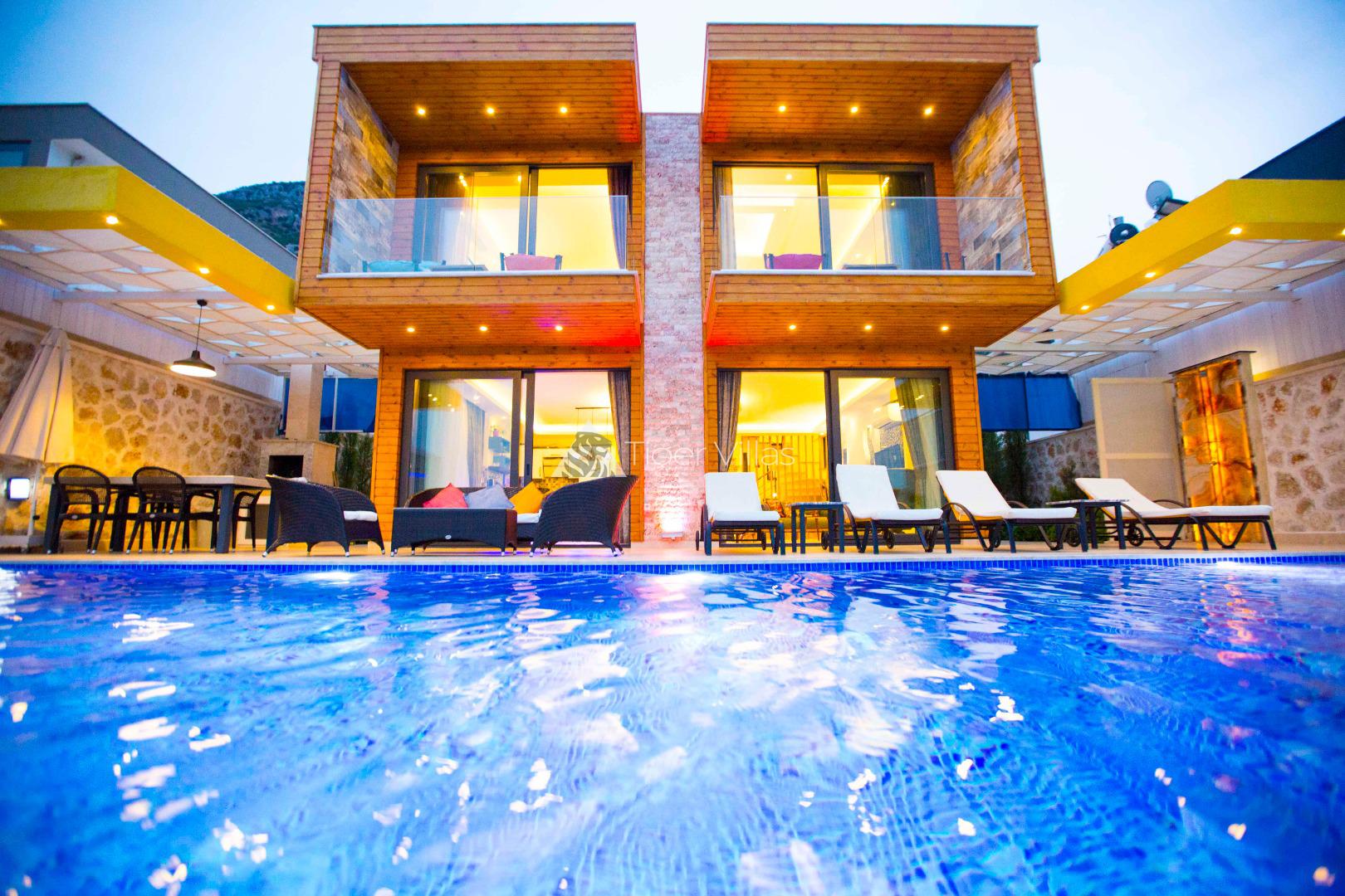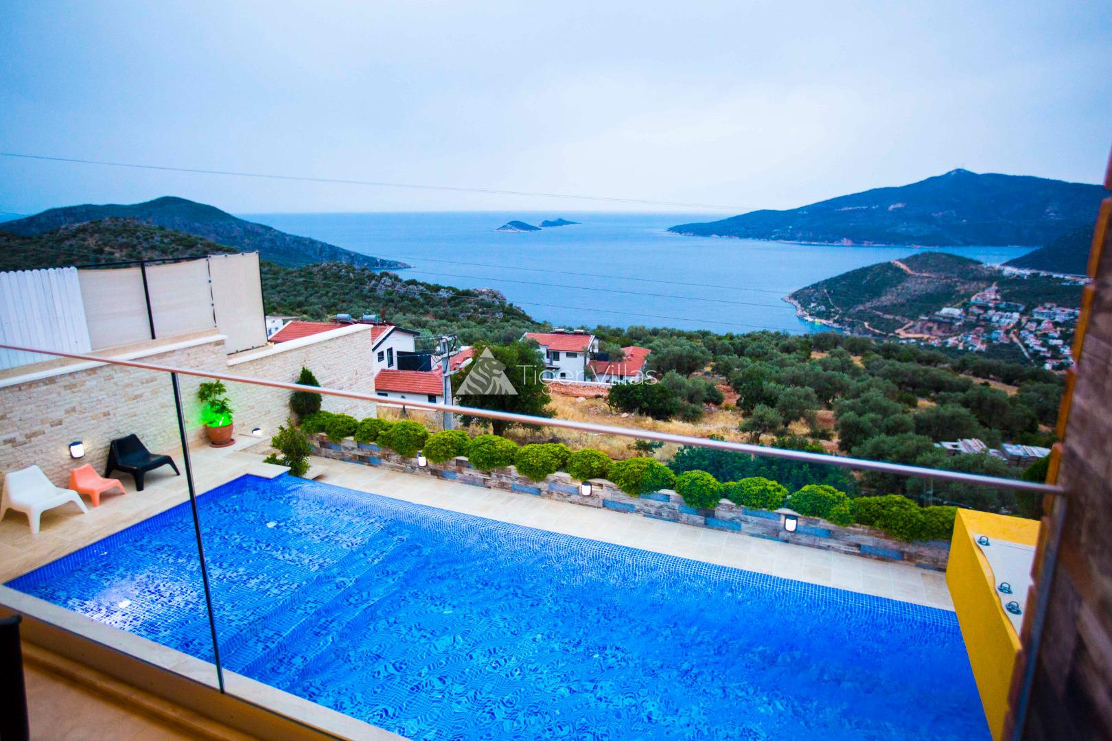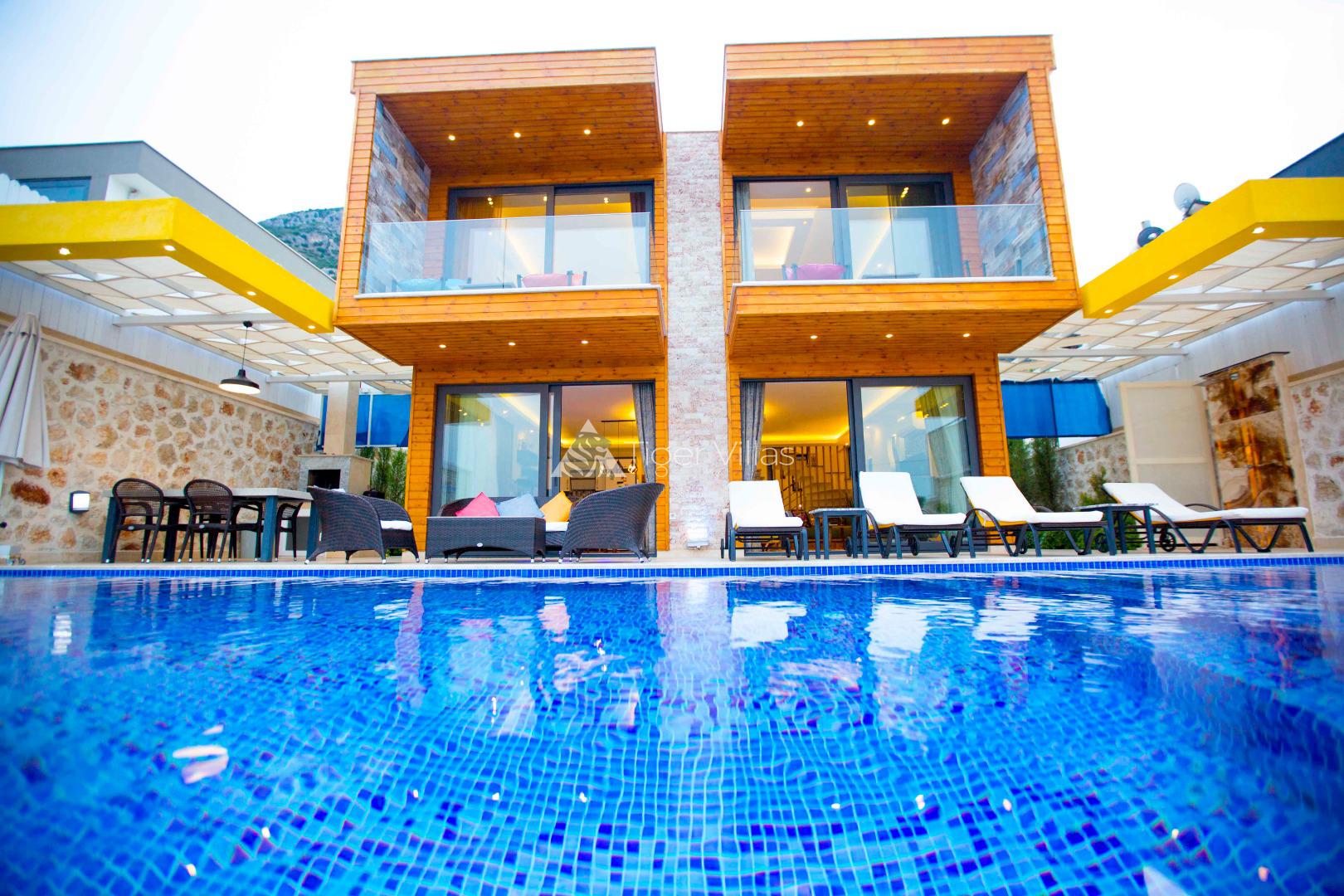Villa Victoria is among the villas for rent with a private swimming pool, which has two suites with a magnificent sea view and can accommodate four people in total. It is close to Kalkan City Center. Bedrooms and living room with American kitchen have sea view. It has a large swimming pool.