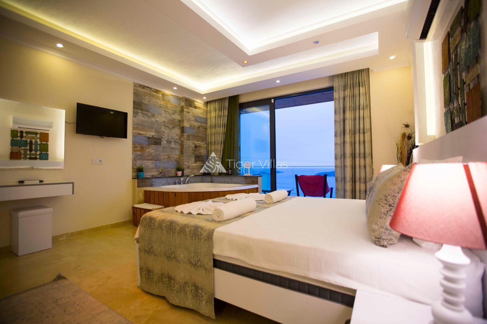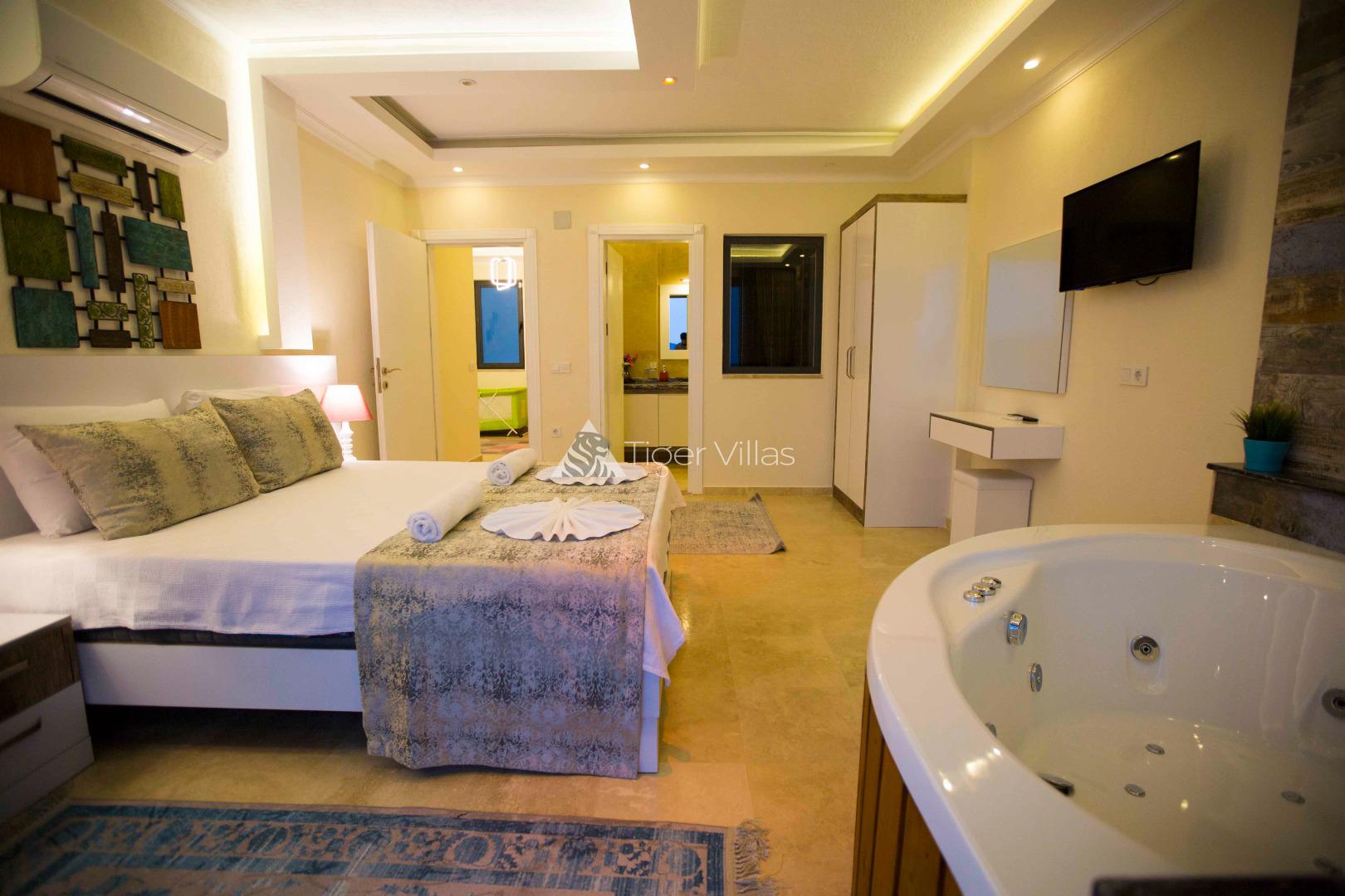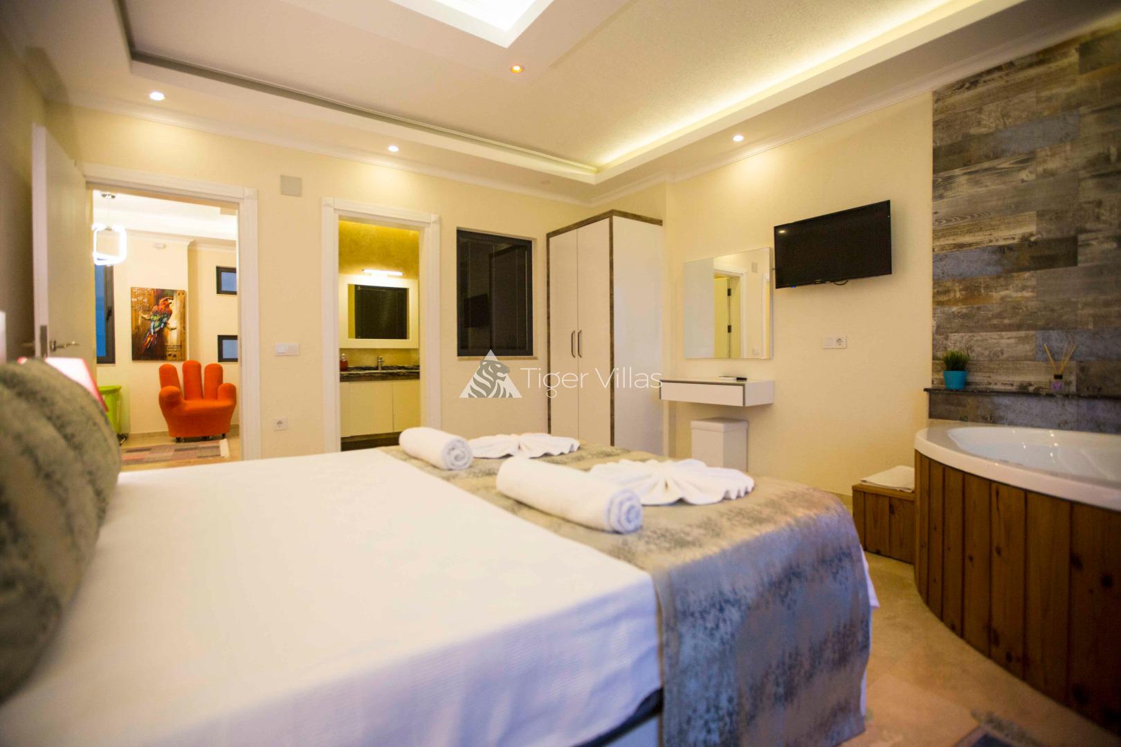 1. Bedroom: Suite room, 1 double bed, air conditioning, bedside table, wardrobe, jacuzzi, WC&bathroom and balcony.