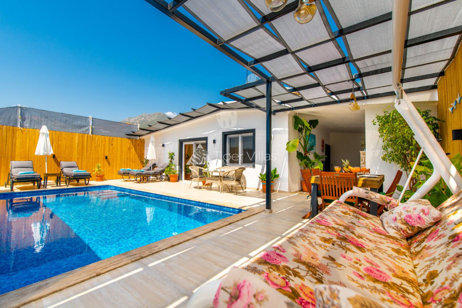 Villa Yasin Ulugöl Our villa, located in Kalkan Ulugöl, has been designed according to the accommodation capacity of four people with two bedrooms. There is a jacuzzi in the suite bedroom. Our holiday villa, which is intertwined with nature, is a villa with a nature view. The pool terrace of our villa is a holiday villa away from foreign eyes. Designed with a sheltered pool area, our villa is an ideal option for conservative families and honeymooners. There is a pool, swing, garden set, dining table in the garden of our villa.