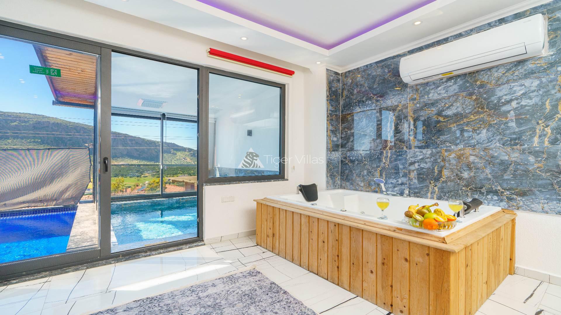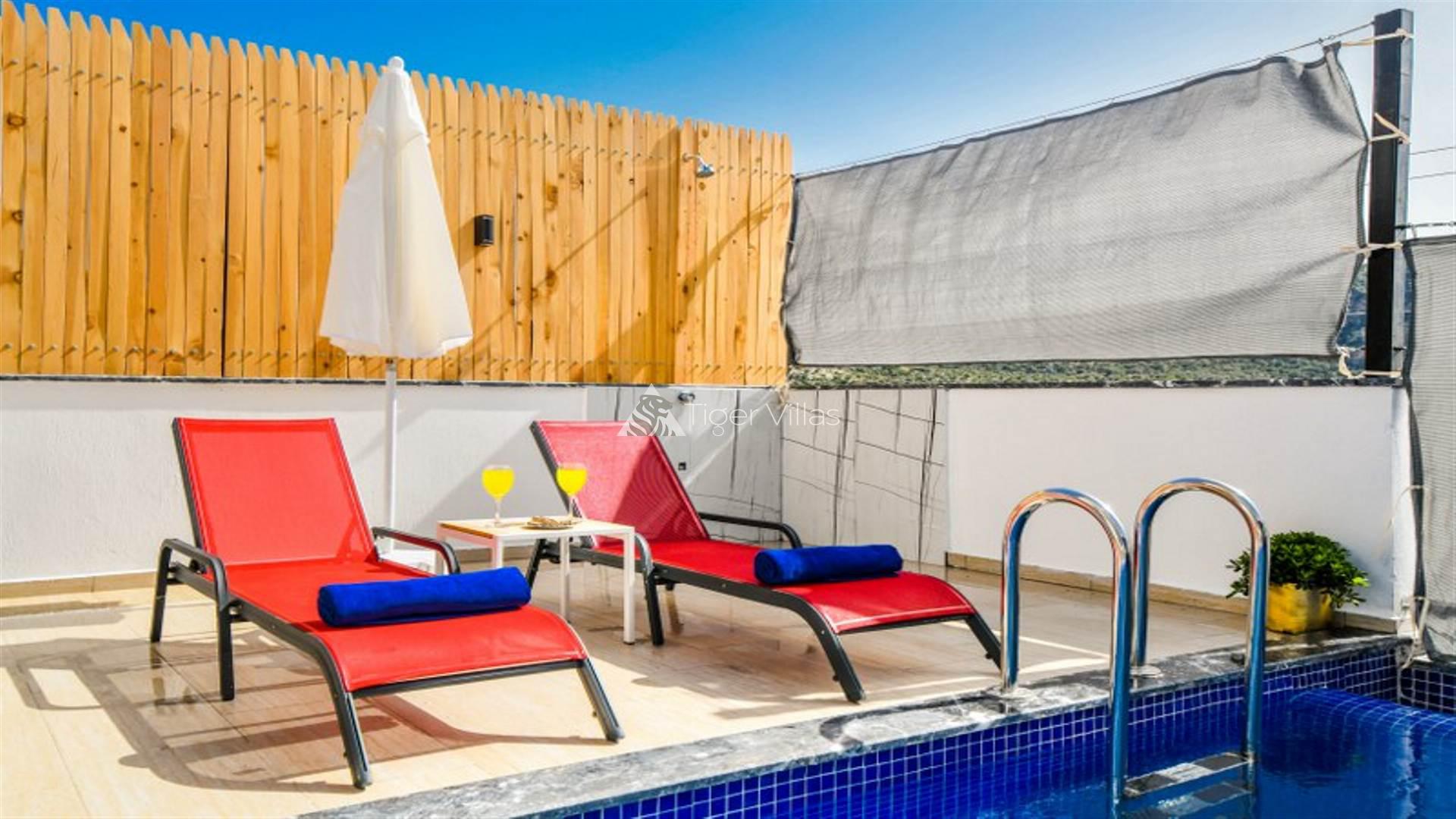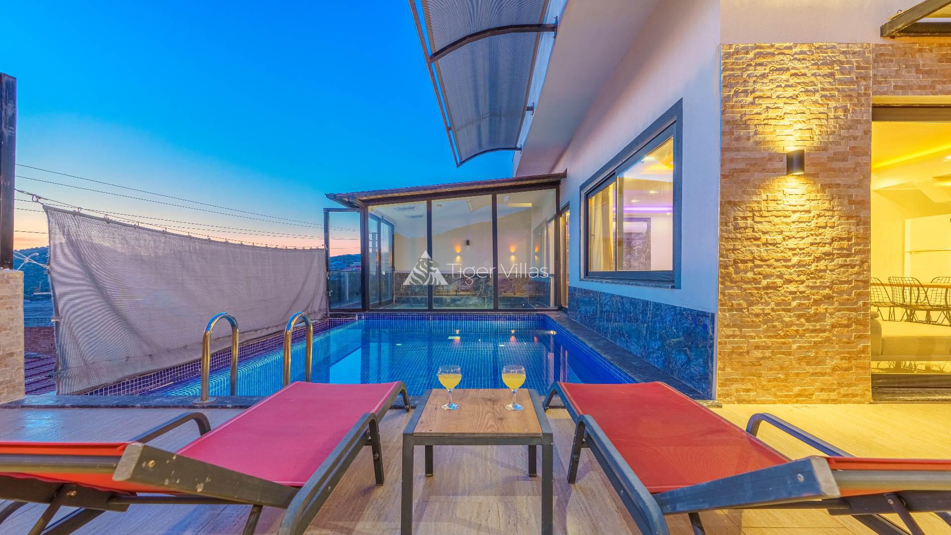 Our villa for rent in Kalkan Ulugöl location is one bedroom and has a capacity of 2 people. Ideal for honeymooners, our villa has a jacuzzi in the bedroom and a private toilet-bath. Many things you may need are thought of in our villa, where you will have a pleasant holiday. Serving its guests during the winter months, Villa Yaz has 4 indoor heated pools. It is also very suitable for honeymoon couples. In addition, the pool terrace of our villa with private pool has been made sheltered with curtains and fences for conservative couples.