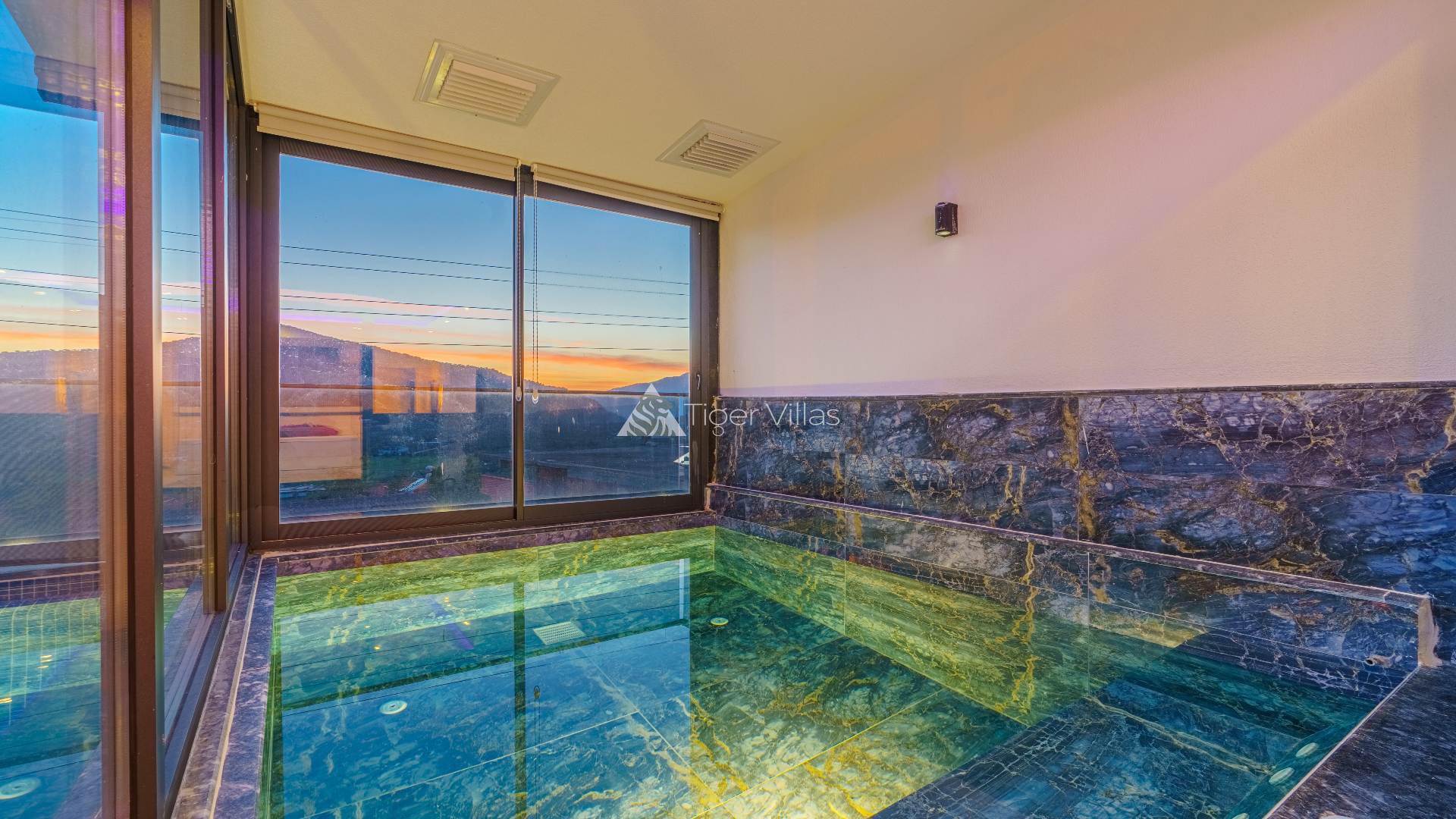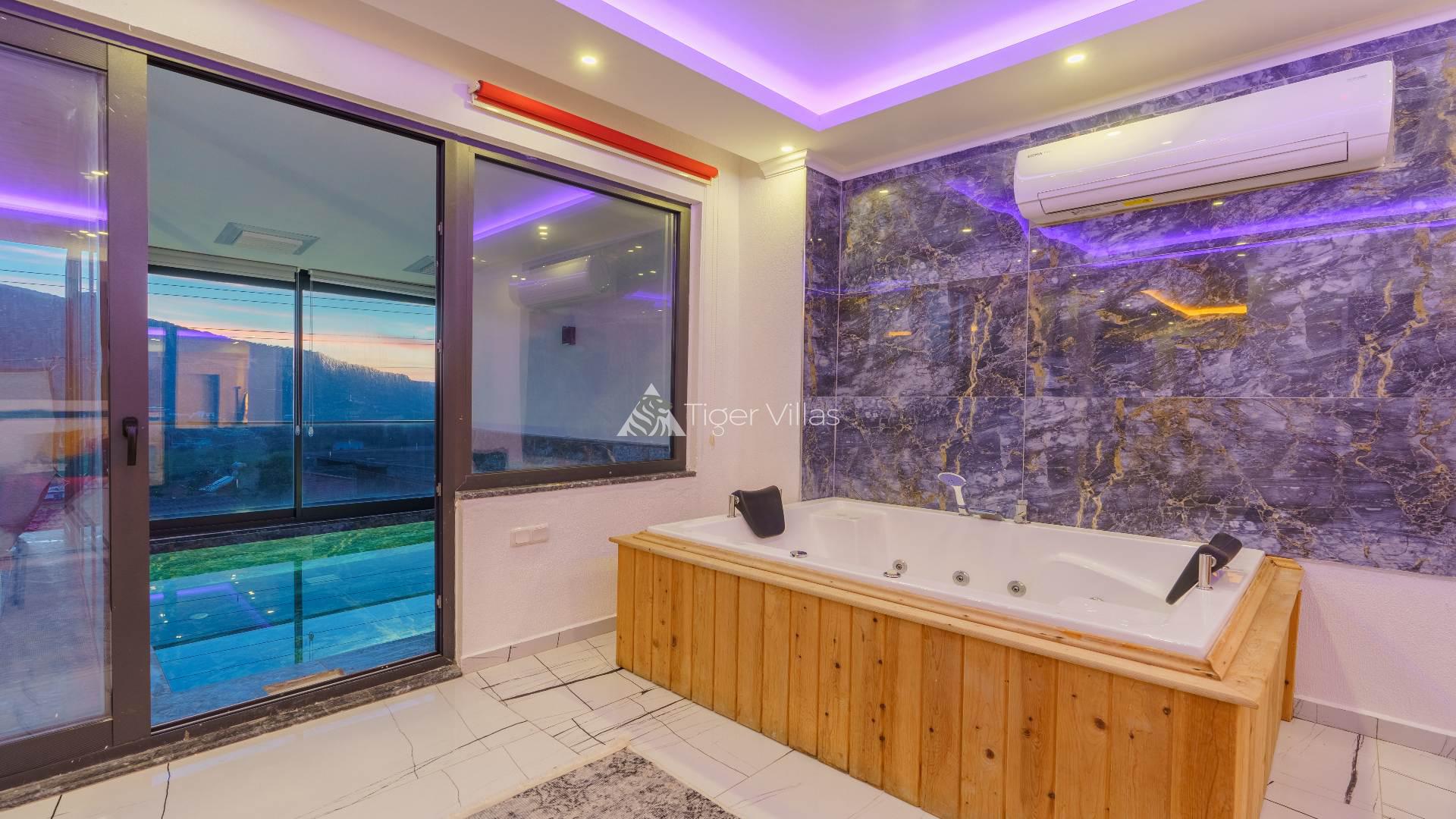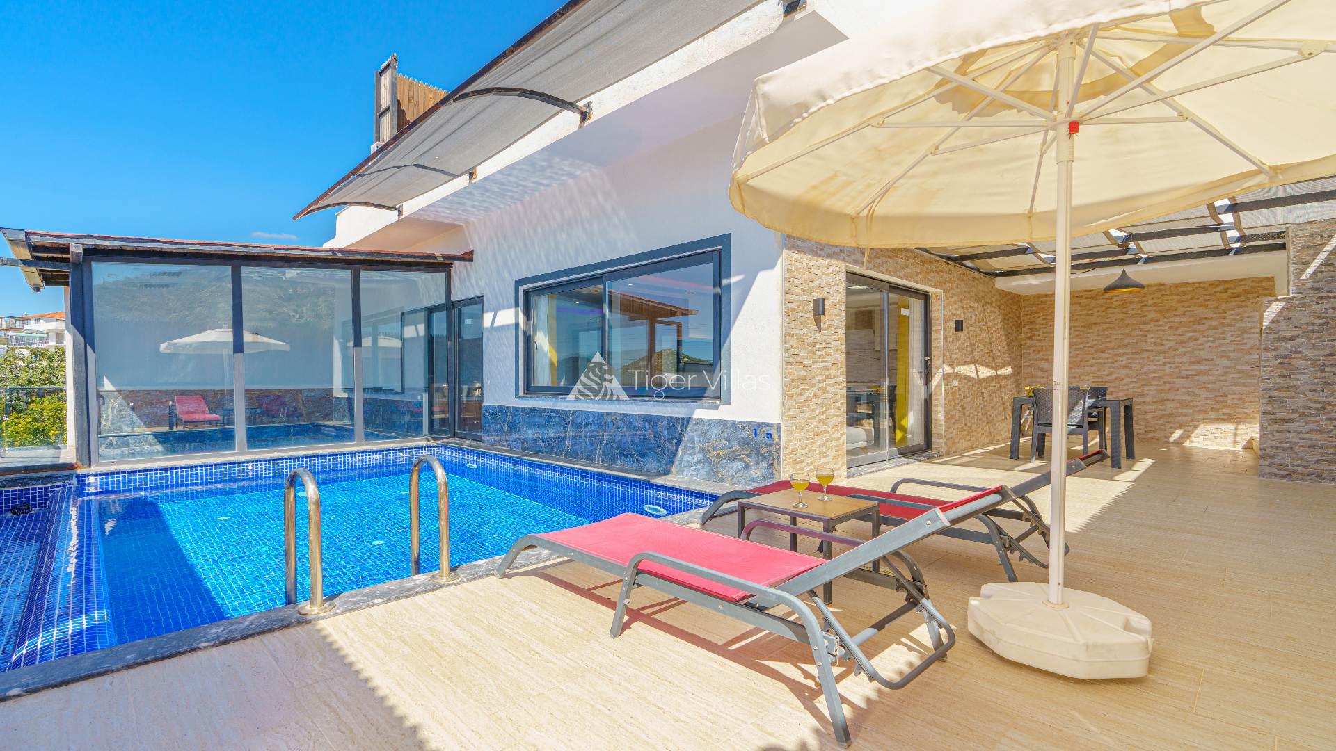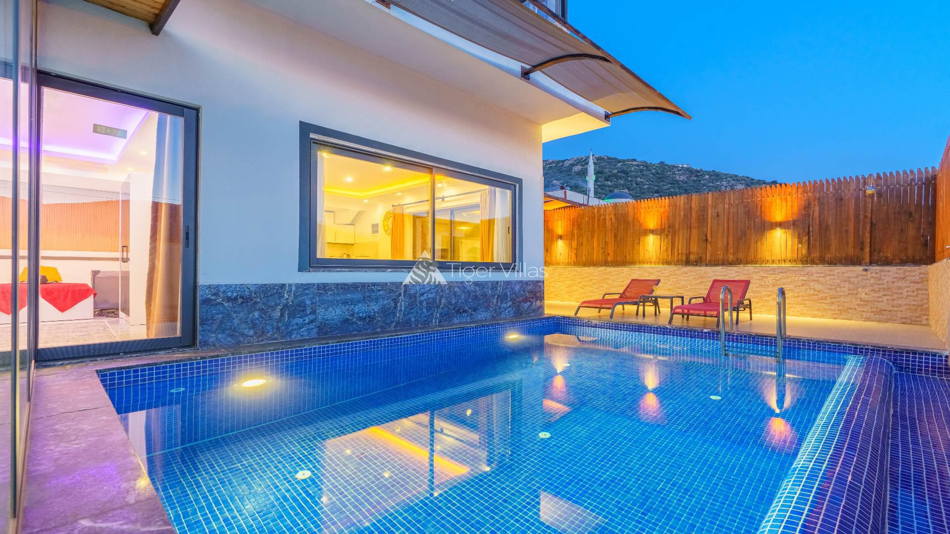 Our villa for rent in Kalkan Ulugöl location is one bedroom and has a capacity of 2 people. Ideal for honeymooners, our villa has a jacuzzi in the bedroom and a private toilet-bath. Many things you may need are thought of in our villa, where you will have a pleasant holiday. Serving its guests during the winter months, Villa Yaz has 4 indoor heated pools. It is also very suitable for honeymoon couples. In addition, the pool terrace of our villa with private pool has been made sheltered with curtains and fences for conservative couples.